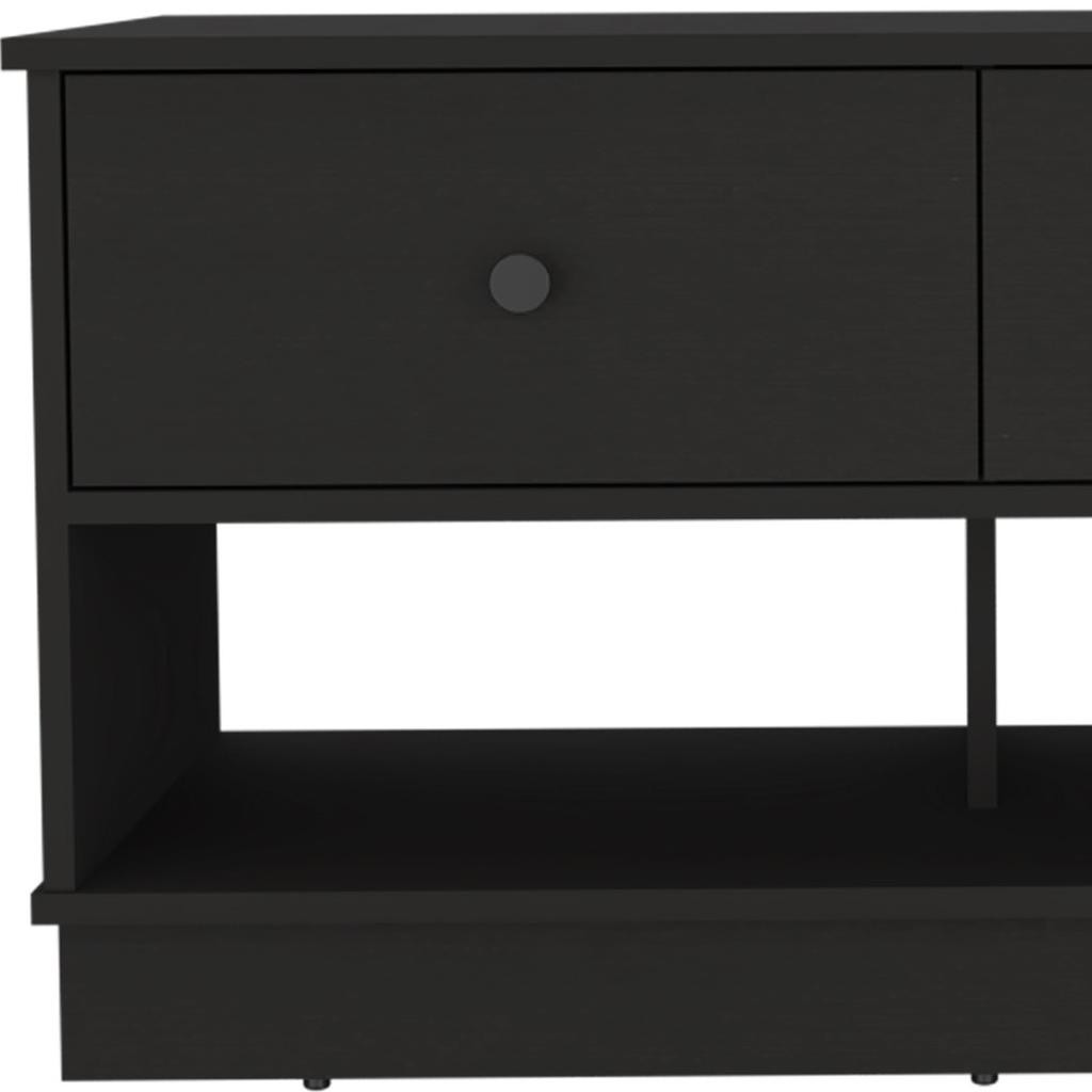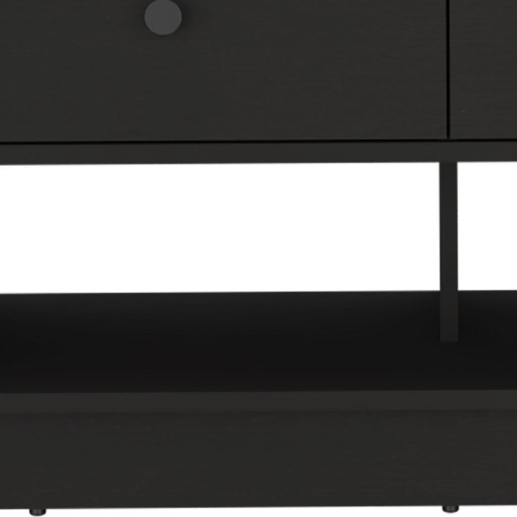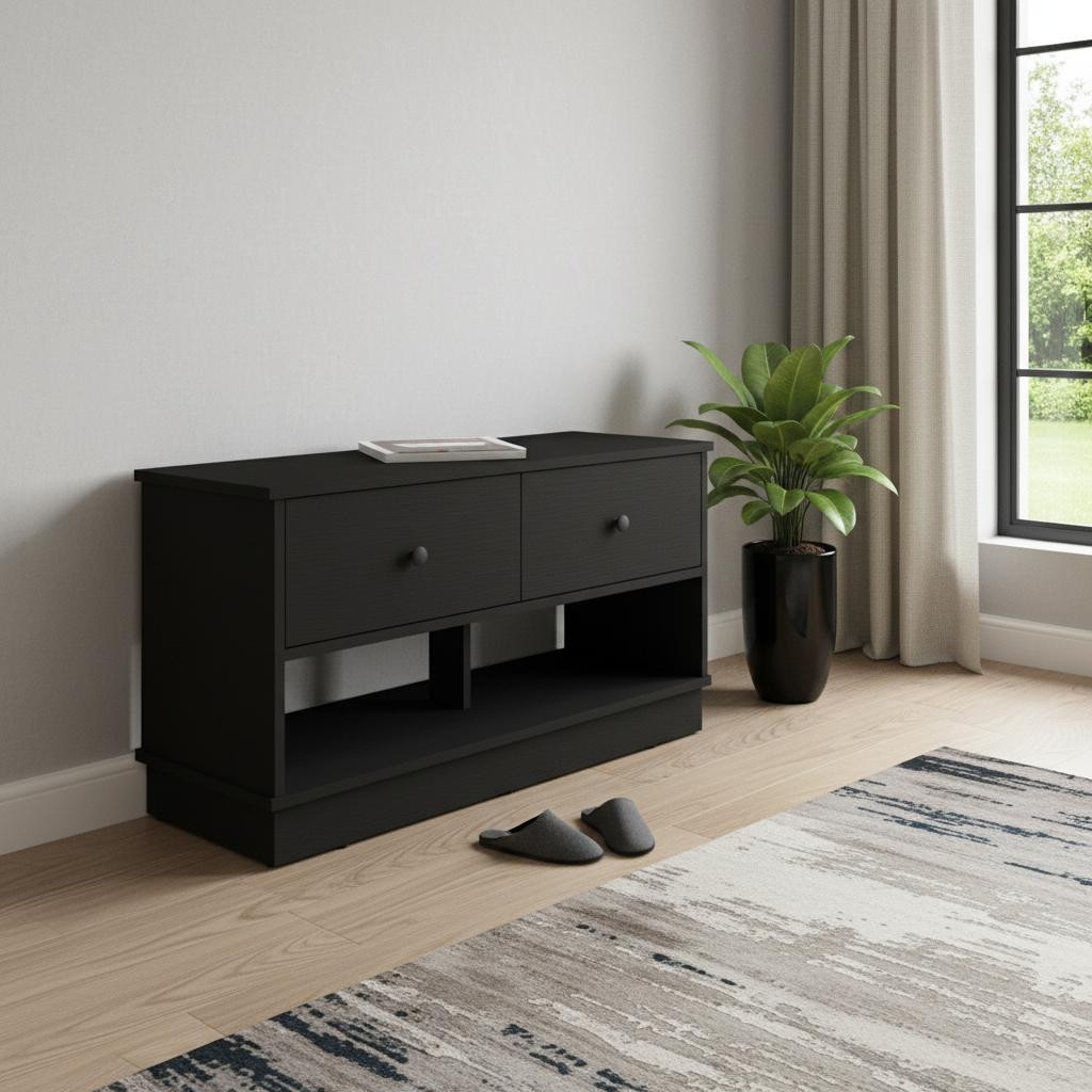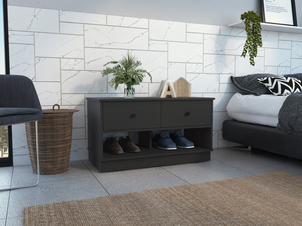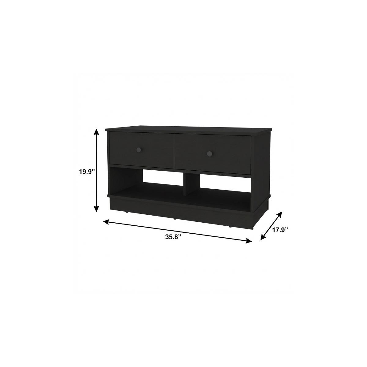 Practicality and fashion mix together with this handy 36-inch black wood storage bench with drawers. This bench is made from high quality manufactured wood in a black color throughout the base and top. This multi-function bench features drawers in addition to seating to help keep your space neat and tidy. Ideal for entrance foyer, hallway, or laundry room. This bench is a great place store your keys, put on your shoes, or be a catchall on your way in or out. Easy to blend into most any room, a bench is a way to add a good looking accent to your space that can also be practical and useful. 19.90-inch h x 35.80-inch w x 17.90-inch d.