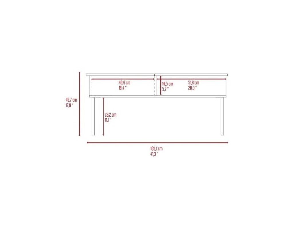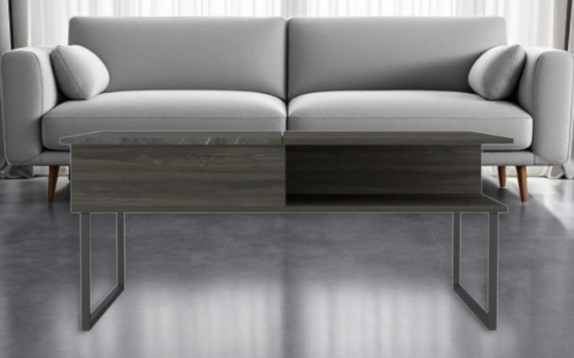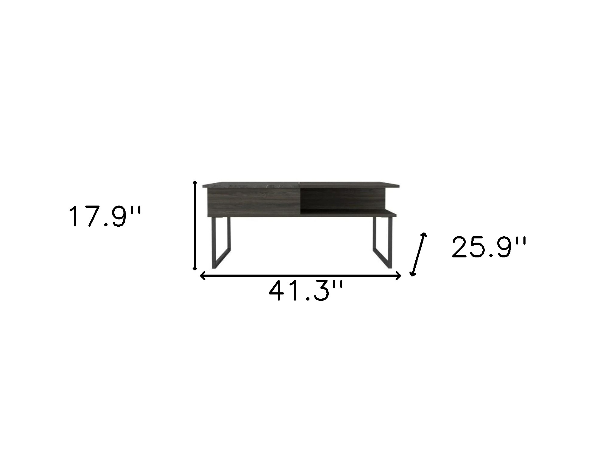 Stylish and super sturdy, the 41-inch gray and onyx metal lift top coffee table with two shelves is an amazingly good looking coffee table that will compliment your living room. The onyx coloration of the high quality metal base marries nicely with the gray manufactured wood top surface. There are 2 shelves that will help to keep clutter at bay. This rectangular table is an classic yet updated way to accent your room. If you're looking for something that can fit into a living area, bedroom, or office, this coffee table is for you. This coffee table is the sturdy, reliable and stylish answer to your living room needs. 17.9-inch H x 41.3-inch W x 25.9-inch D