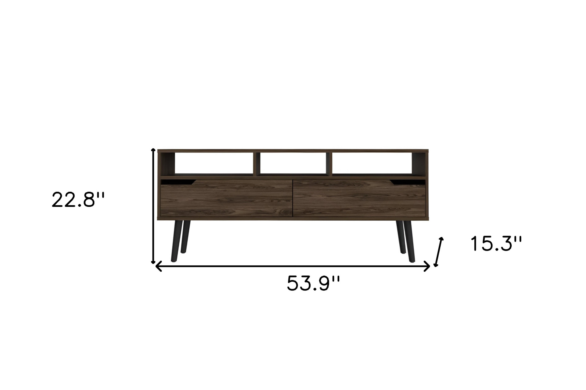 Create the ultimate blend of style, function, and design with this 54-inch dark brown wood enclosed and open storage tv stand. Designed to be sturdy and long lasting, this versatile furniture piece is crafted from durable manufactured wood and features a contemporary design style. To add to the versatility, this piece features open non-concealed storage that can be used for not only storage but display as well. A cord cut out hole is ideal for wire and cable managment to keep your space look tidy. Ideal for tv placement and storage in your living room, bedroom or office. 22.8-inch h x 53.9-inch w x 15.3-inch d.