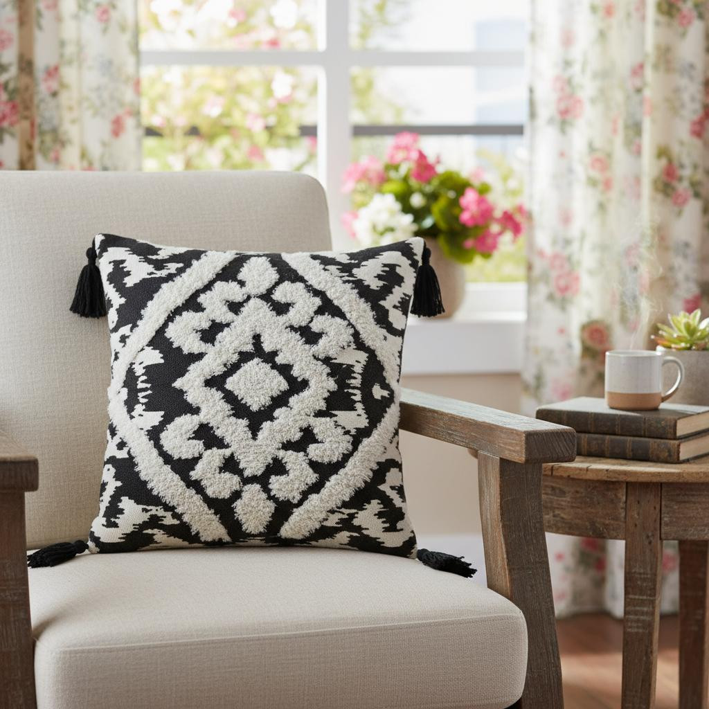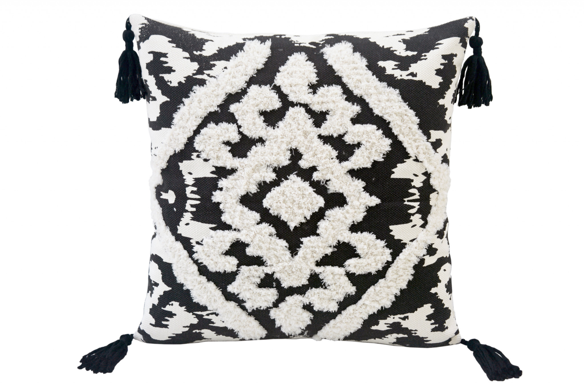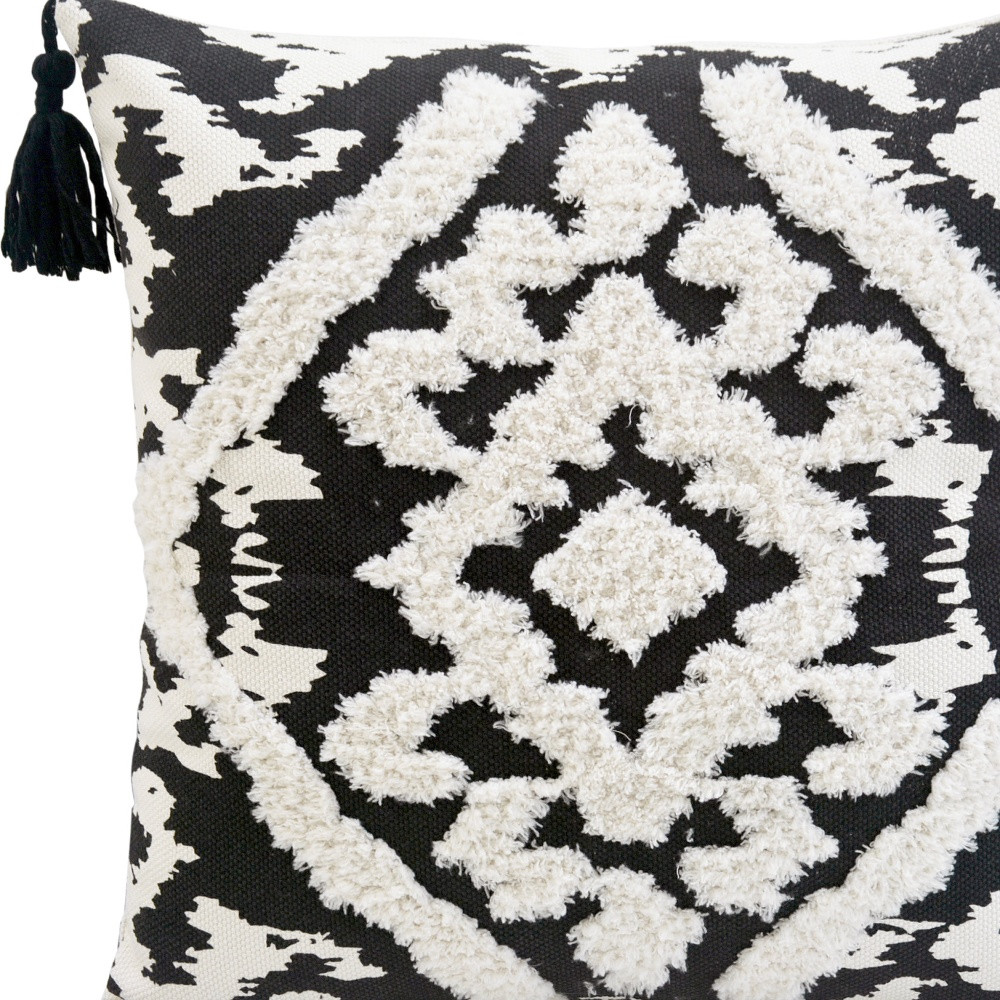 Add an air of fashion to your room and rejuvenate the space with this cute and fashionable 17-inch black and white throw pillow with tassels. Durable black and white polyester and cotton blend has been used to give this pillow a beautiful look that will stand the test of time. Fun and decorative tassels add some high end and hand-crafted textural designer touches. This soft cotton filled pillow not only is decorative but made to be comfy and cozy all day long. Great to use on its own or mix with other decorations for the perfect look. Decorative throw pillows not only add color and dimension to your space but can be comfy and supportive when you are lounging and cuddling as well. 17-inch h x 17-inch w x 4-inch d.