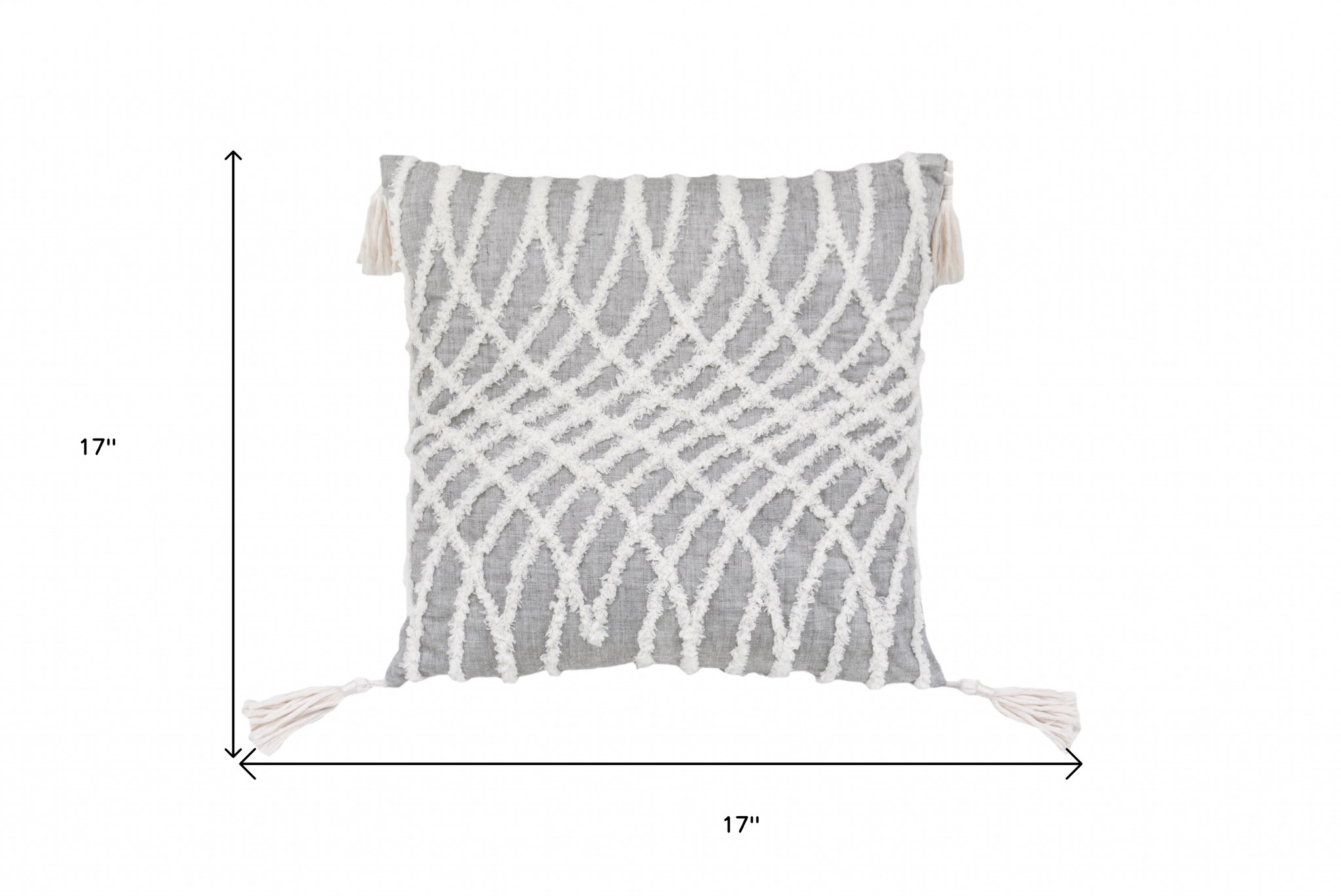 This 17-inch gray and white throw pillow with tassels will add a beautiful decorative accent to your decor. This soft and durable decorative pillow is expertly made of high grade, long lasting polyester in a gray and white coloration. Fun and decorative tassels add some high end and hand-crafted textural designer touches. Super soft and built to hold its shape, this polyester-filled pillow is a great option. Great to use on its own or mix with other decorations for the perfect look. Decorative throw pillows not only add color and dimension to your space but can be comfy and supportive when you are lounging and cuddling as well. 17-inch h x 17-inch w x 4-inch d.