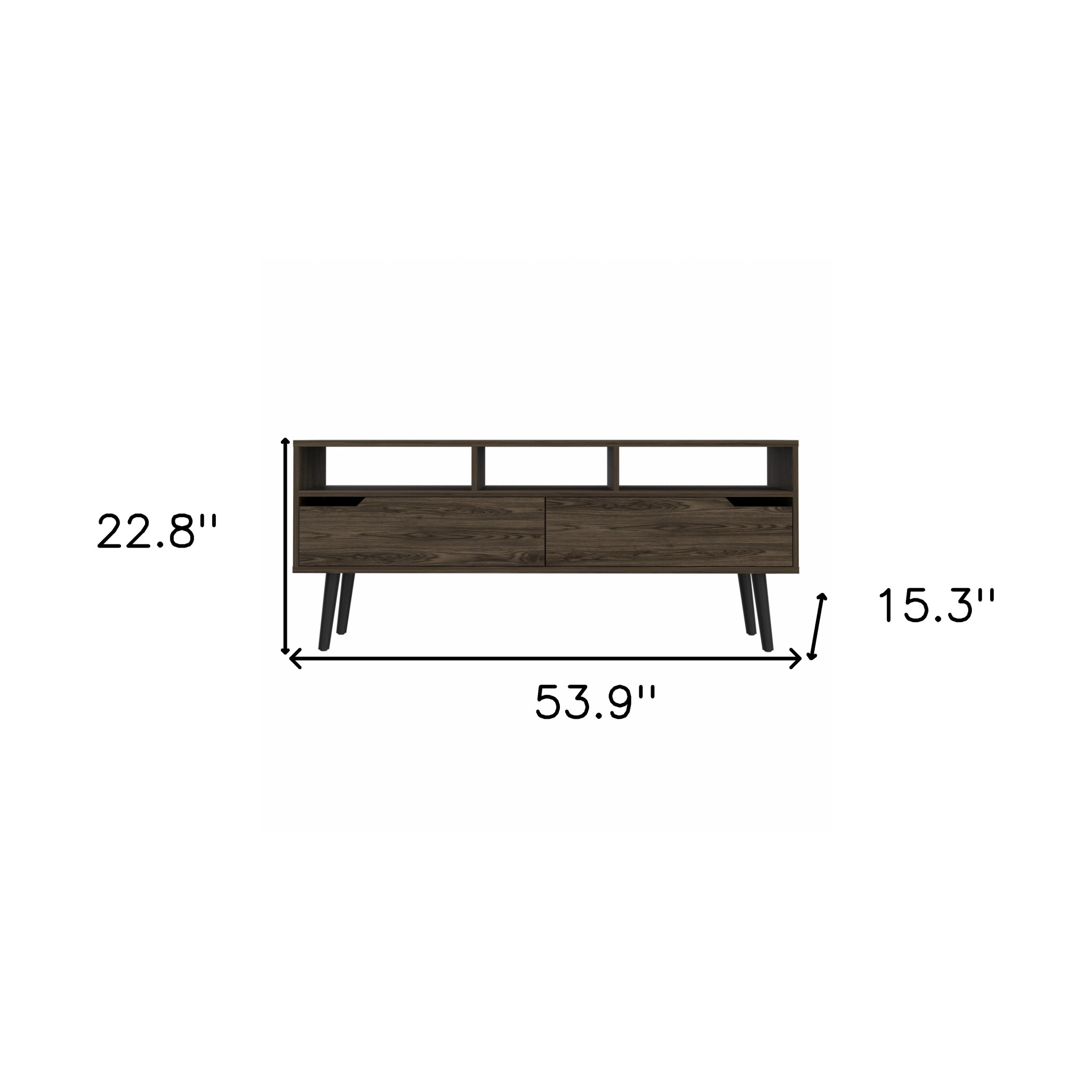 Practical, space saving, and good looking, this 54-inch dark brown walnut tv stand is a versatile media storage solution. To add to the versatility, this piece features open non-concealed storage that can be used for not only storage but display as well. A built-in cable and wire management helps to keep those unseemly wires at bay. Ideal for tv placement and storage in your living room, bedroom or office. 22.8-inch h x 53.9-inch w x 15.3-inch d