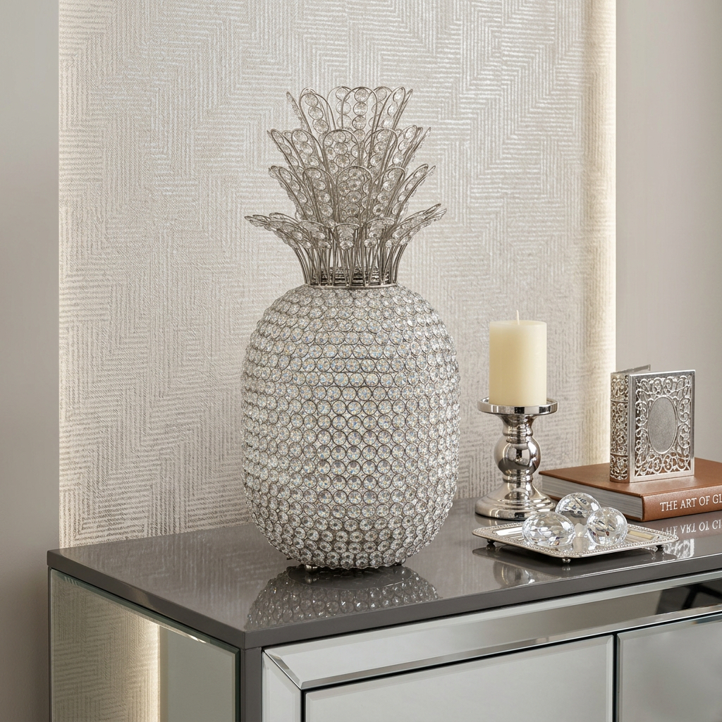 Glamorous and fabulous, this 23" Glam Bling Faux Crystal and Silver Pineapple will make a great statement piece. This gorgeous silver pineapple is adorned with faux crystals that give it lots of sparkly and fashionable appeal. Use as a great accent piece on your dining table, coffee table, console table and more. Includes a space at the base to hold a tea light which when lit will magnify the sparkles even more! 23" x 10" x 10"