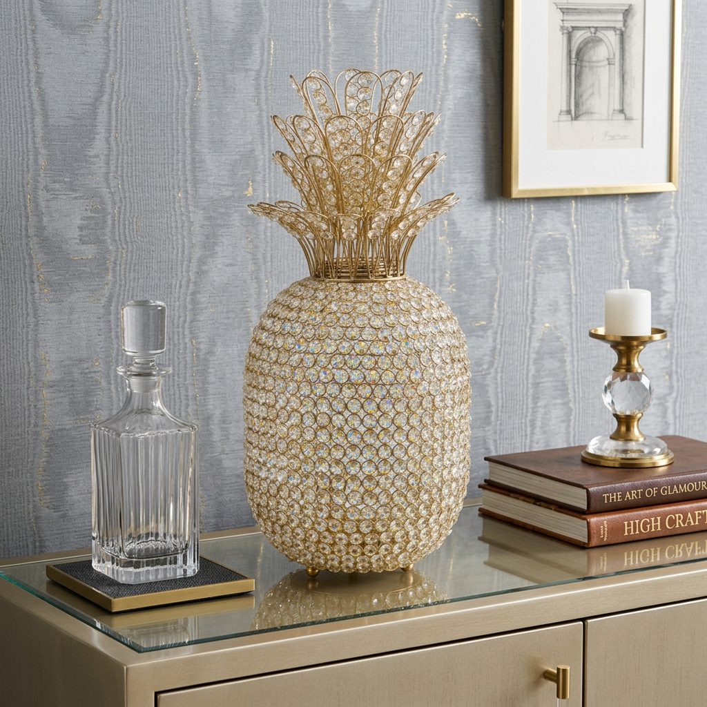 Glamorous and fabulous, this 23" Glam Bling Faux Crystal and Gold Pineapple will make a great statement piece. This gorgeous gold pineapple is adorned with faux crystals that give it lots of sparkly and fashionable appeal. Use as a great accent piece on your dining table, coffee table, console table and more. Includes a space at the base to hold a tea light which when lit will magnify the sparkles even more! 23" x 10" x 10"