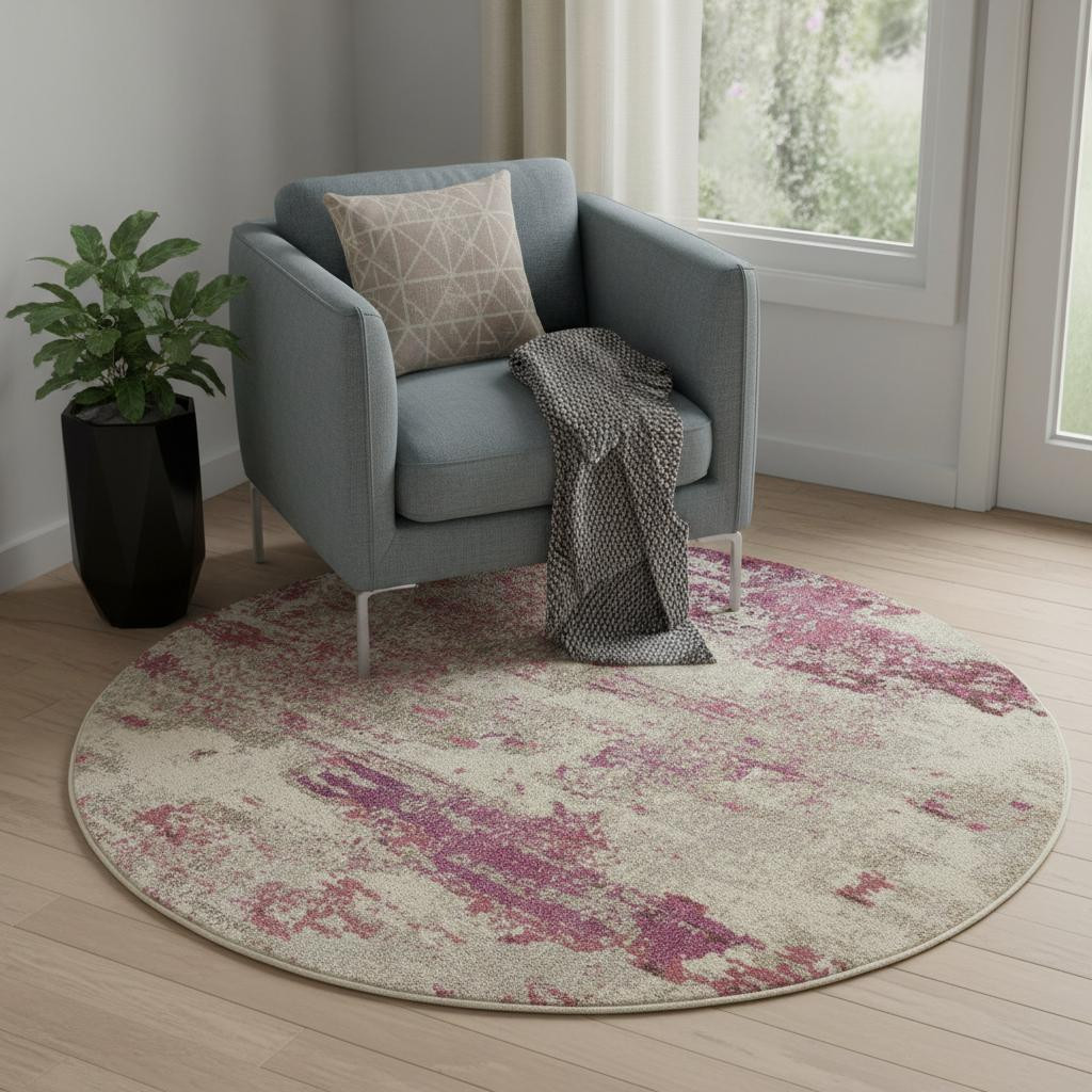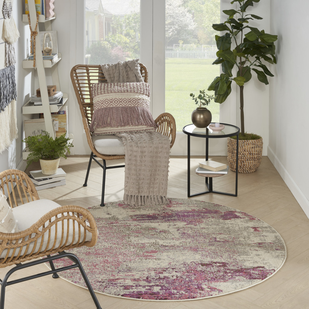 Set an inviting tone in your space with this 5' x 5' ivory and pink round abstract power loom non skid area rug. This geometric round shaped rug features a abstract pattern in ivory and pink that combines a good looking print with a unique and updated shape. The mix of shape, color, and design gives this rug refreshing visual interest. Made in Turkey, this rug offers high quality combined with good looking designer sensibilities. Area Rugs help to give warmth and sense of home to your space. .50" H x 63.00" W x 63.00" D