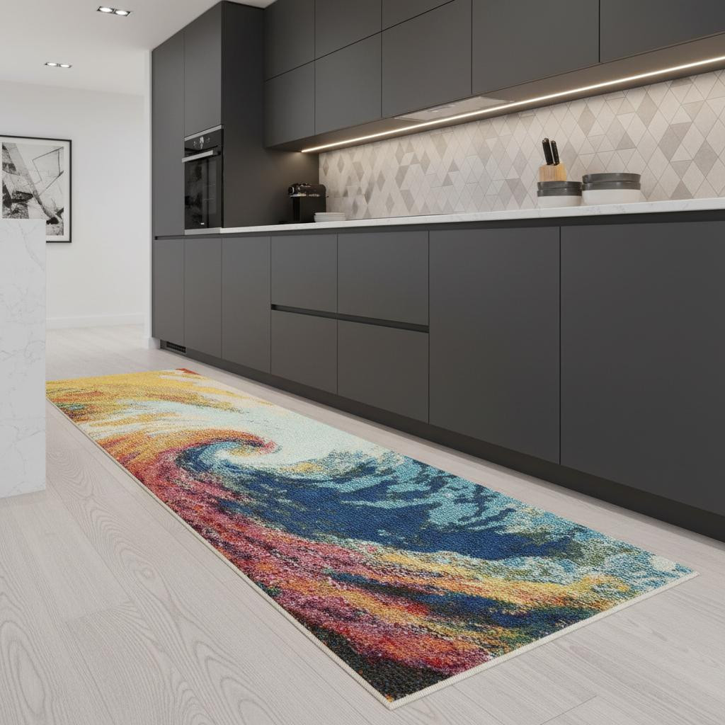 This 2' x 8' wave abstract power loom non skid runner rug, is a great way to add warmth to a room. This runner shaped rug features a abstract design in wave to give it visual interest. A classic shape marries with good looking design for your space This superior Turkish rug represents the highest quality and is built to last. Place this area rug against a hardwood or tile floor and it will enliven your living space with style and sophistication. .50" H x 26.00" W x 90.00" D