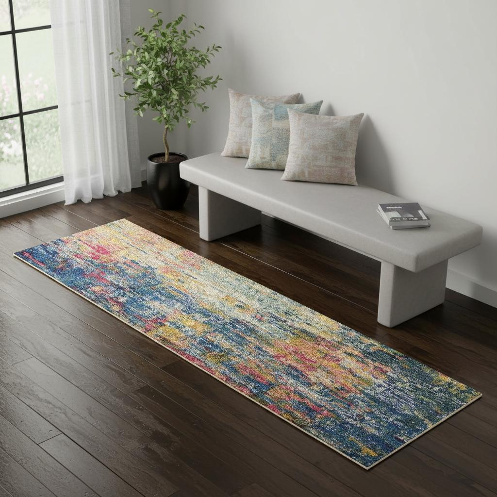 Add great coloration and comfortable texture to your space with this 2' x 6' blue and yellow abstract power loom non skid area rug. This rectangle shaped rug features a abstract design in blue and yellow to give it visual interest. A classic shape marries with good looking design for your space This superior Turkish rug represents the highest quality and is built to last. Place this area rug against a hardwood or tile floor and it will enliven your living space with style and sophistication. .50" H x 24" W x 72" D