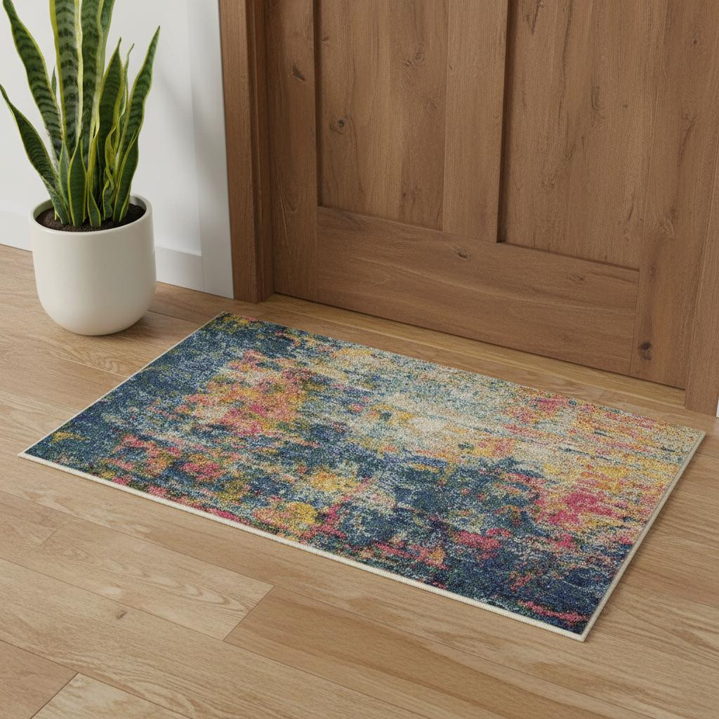 This 2' x 4' blue and yellow abstract power loom non skid area rug, is a great way to add warmth to a room. This rectangle shaped rug features a abstract design in blue and yellow to give it visual interest. A classic shape marries with good looking design for your space This superior Turkish rug represents the highest quality and is built to last. Place this area rug against a hardwood or tile floor and it will enliven your living space with style and sophistication. .50" H x 26" W x 45" D