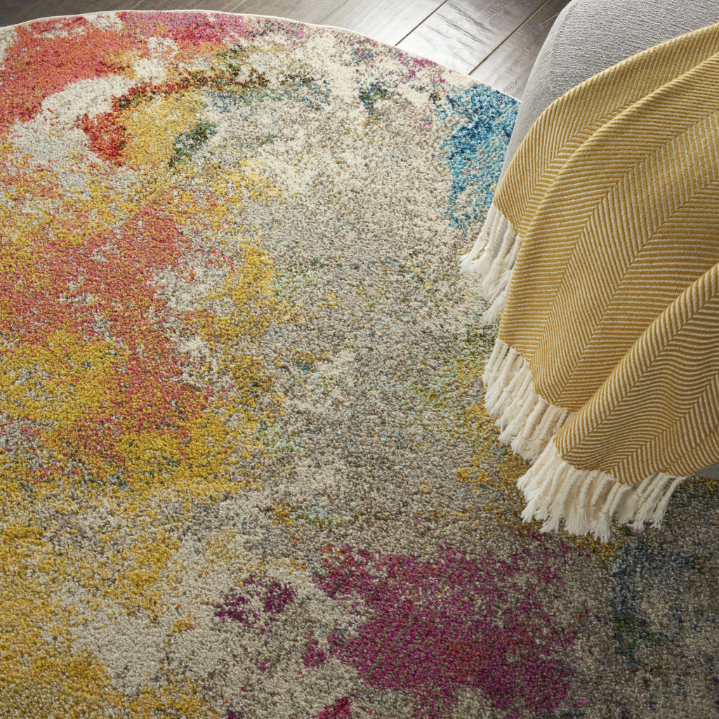 Set an inviting tone in your space with this 4-foot ivory abstract round rug. Built to last, this rug crafted from polypropylene fibers is known for its durability and long lasting appeal. Rugs are a great way to showcase your style, hide imperfections, warm your home and reduce noise. This geometric round shaped rug features a abstract pattern in ivory that combines a good looking print with a unique and updated shape. The mix of shape, color, and design gives this rug refreshing visual interest. 48-inch h x 48-inch w x 0.5-inch d.
