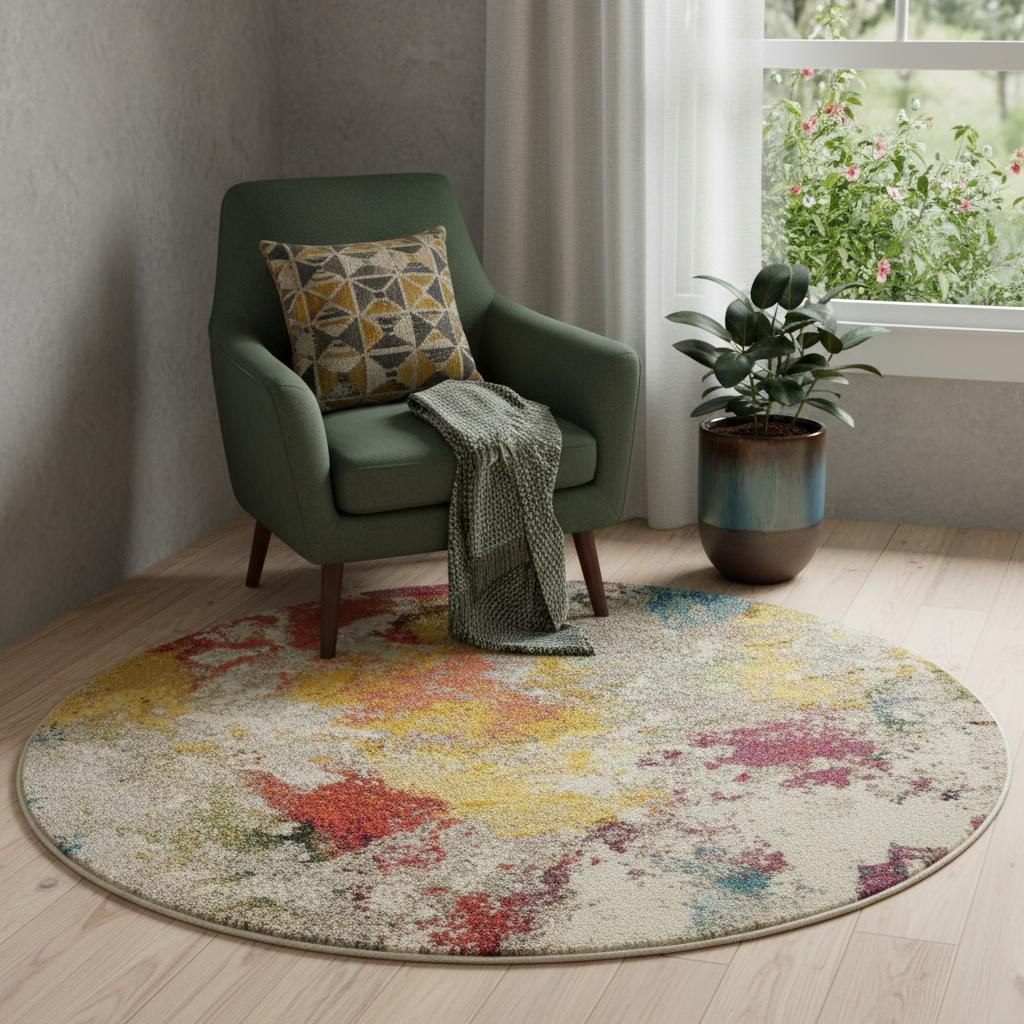 Set an inviting tone in your space with this 5' x 5' ivory round abstract power loom non skid area rug. This geometric round shaped rug features a abstract pattern in ivory that combines a good looking print with a unique and updated shape. The mix of shape, color, and design gives this rug refreshing visual interest. This superior Turkish rug represents the highest quality and is built to last. Place this area rug against a hardwood or tile floor and it will enliven your living space with style and sophistication. .50" H x 63" W x 63" D