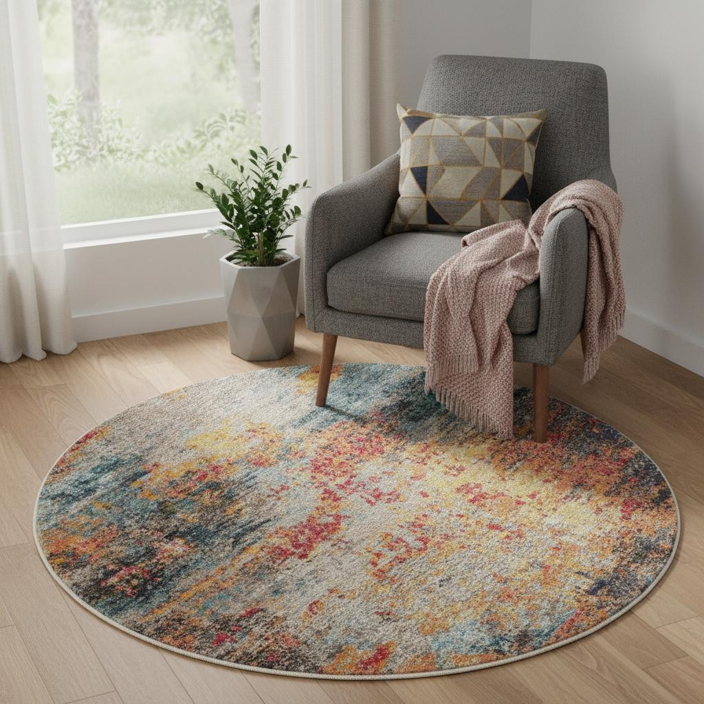 Add great coloration and comfortable texture to your space with this 5-foot blue and orange abstract round rug. Built to last, this rug crafted from polypropylene fibers is known for its durability and long lasting appeal. Rugs are a great way to showcase your style, hide imperfections, warm your home and reduce noise. This geometric round shaped rug features a abstract pattern in blue and orange that combines a good looking print with a unique and updated shape. The mix of shape, color, and design gives this rug refreshing visual interest. 63-inch h x 63-inch w x 0.5-inch d.