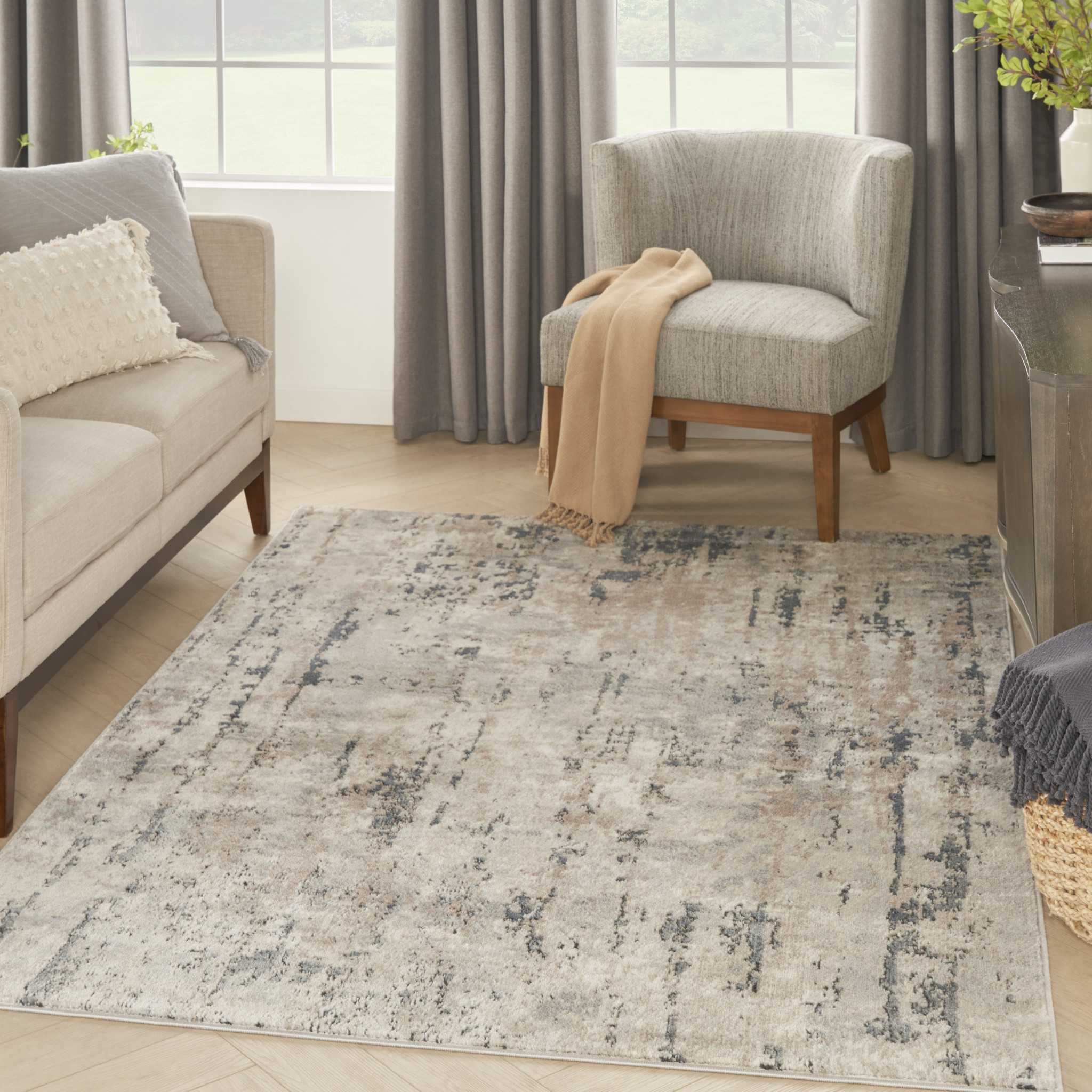 Set an inviting tone in your space with this 4' x 6' beige and grey abstract power loom non skid area rug. This rectangle shaped rug features a abstract design in beige and grey to give it visual interest. A classic shape marries with good looking design for your space This superior Turkish rug represents the highest quality and is built to last. Place this area rug against a hardwood or tile floor and it will enliven your living space with style and sophistication. .32" H x 45.00" W x 69.00" D
