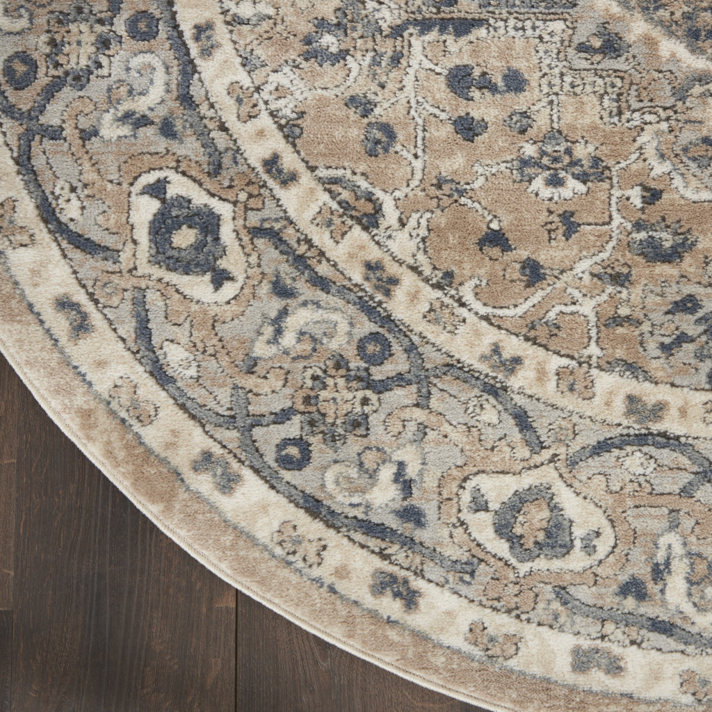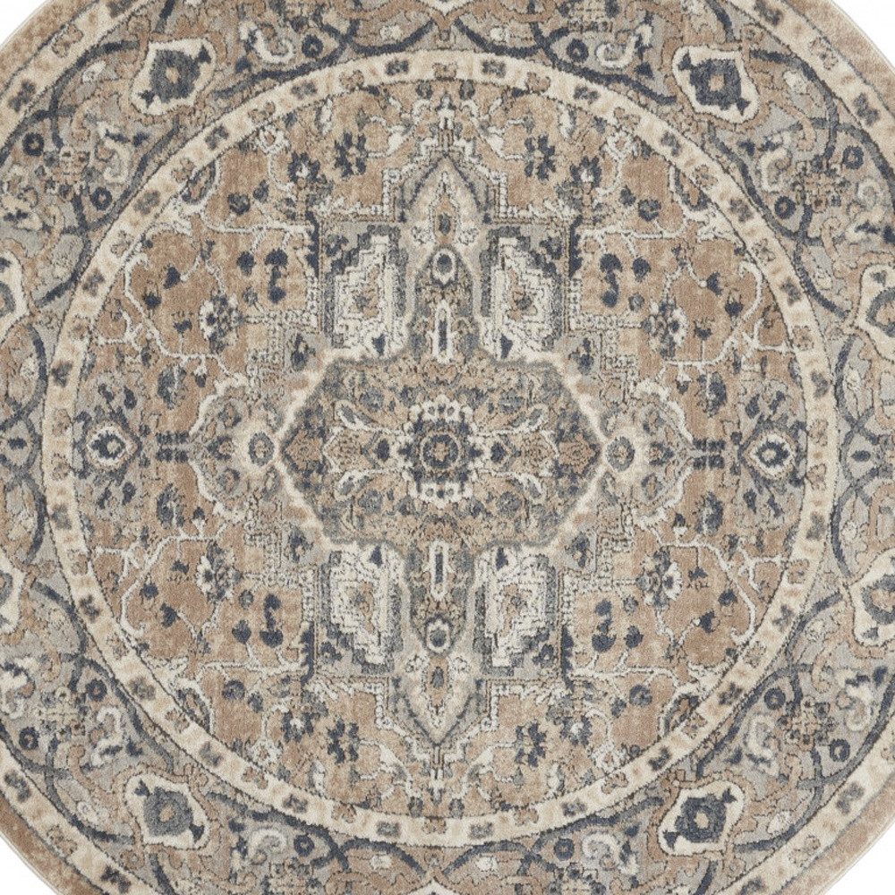 Add some artistry to your room with this 4-foot beige and ivory oriental distressed round rug. Ideal for spaces with kids and pets, this rug is stain resistant to help repel dirt and spilled liquids. Built to last, this rug crafted from polypropylene and polyester fibers is known for its durability and long lasting appeal. Rugs are a great way to showcase your style, hide imperfections, warm your home and reduce noise. 48-inch h x 48-inch w x 0.32-inch d.