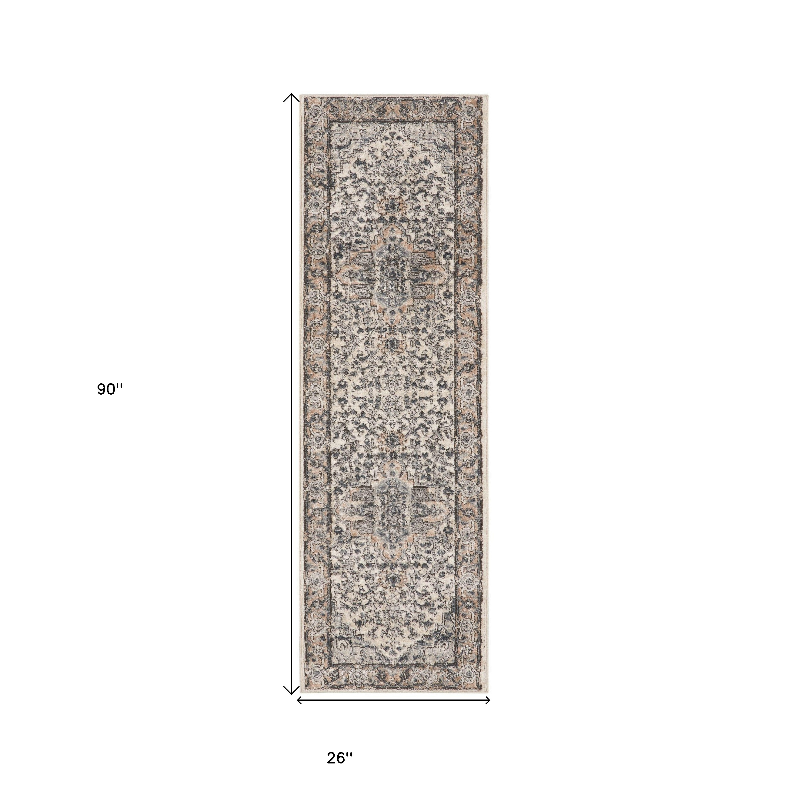 Add great coloration and comfortable texture to your space with this 8-foot beige and gray medallion runner rug. Built to last, this rug crafted from polypropylene and polyester fibers is known for its durability and long lasting appeal. Rugs are a great way to showcase your style, hide imperfections, warm your home and reduce noise. This rectangular shaped rug features a abstract design that will add a functional and decorative accent to your space. This transitional style runner makes a great accent for the hallway, in front of cabinets, in the laundry room, or any other space you need a narrow and long rug. 26-inch h x 90-inch w x 0.32-inch d.