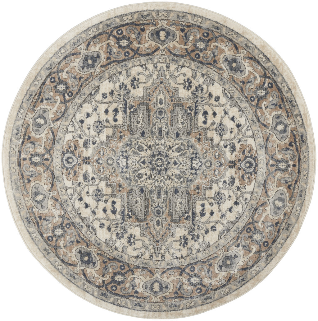 This 5' x 5' ivory and grey round oriental non skid area rug, is a great way to add warmth to a room. This geometric round shaped rug features a oriental pattern in ivory and grey that combines a good looking print with a unique and updated shape. The mix of shape, color, and design gives this rug refreshing visual interest. This superior Turkish rug represents the highest quality and is built to last. Place this area rug against a hardwood or tile floor and it will enliven your living space with style and sophistication. .32" H x 63.00" W x 63.00" D