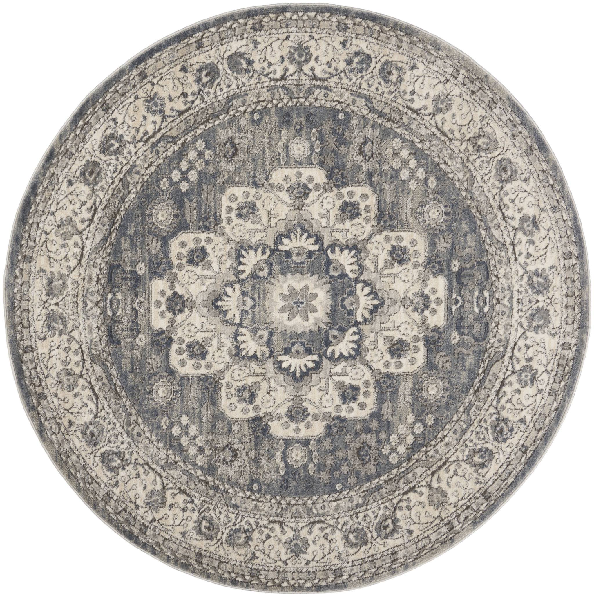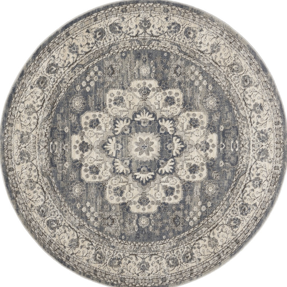 This 5-foot gray and ivory oriental distressed round rug, is a great way to add warmth to a room. Ideal for spaces with kids and pets, this rug is stain resistant to help repel dirt and spilled liquids. Built to last, this rug crafted from polypropylene and polyester fibers is known for its durability and long lasting appeal. Rugs are a great way to showcase your style, hide imperfections, warm your home and reduce noise. This larger sized, contemporary styled rug is ready to create a focal point or statement piece in your room. 63-inch h x 63-inch w x 0.32-inch d.