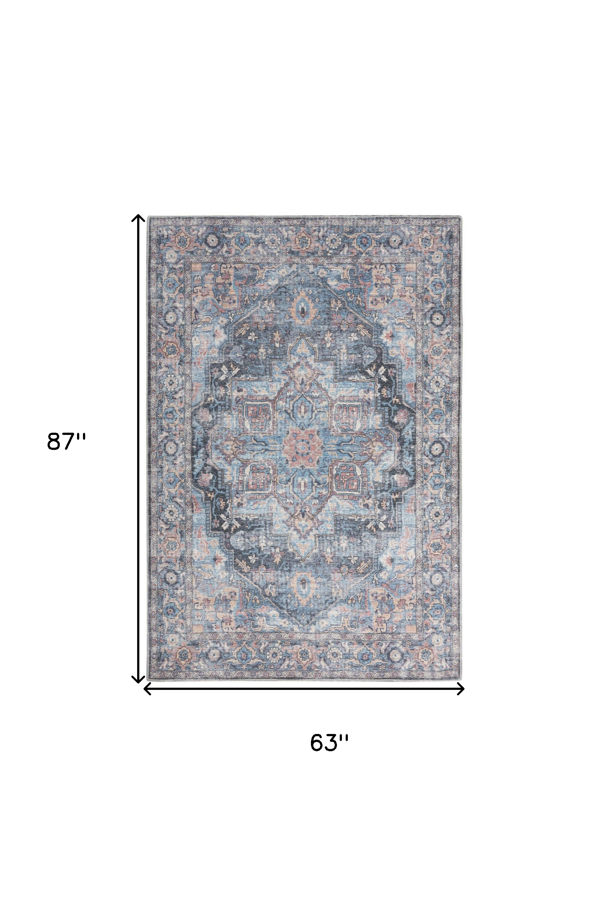 Set an inviting tone in your space with this 5' x 7' light blue oriental power loom distressed washable area rug. This rectangle shaped rug features a oriental design in light blue to give it visual interest. A classic shape marries with good looking design for your space This superior Turkish rug represents the highest quality and is built to last. Place this area rug against a hardwood or tile floor and it will enliven your living space with style and sophistication. .28" H x 63.00" W x 87.00" D