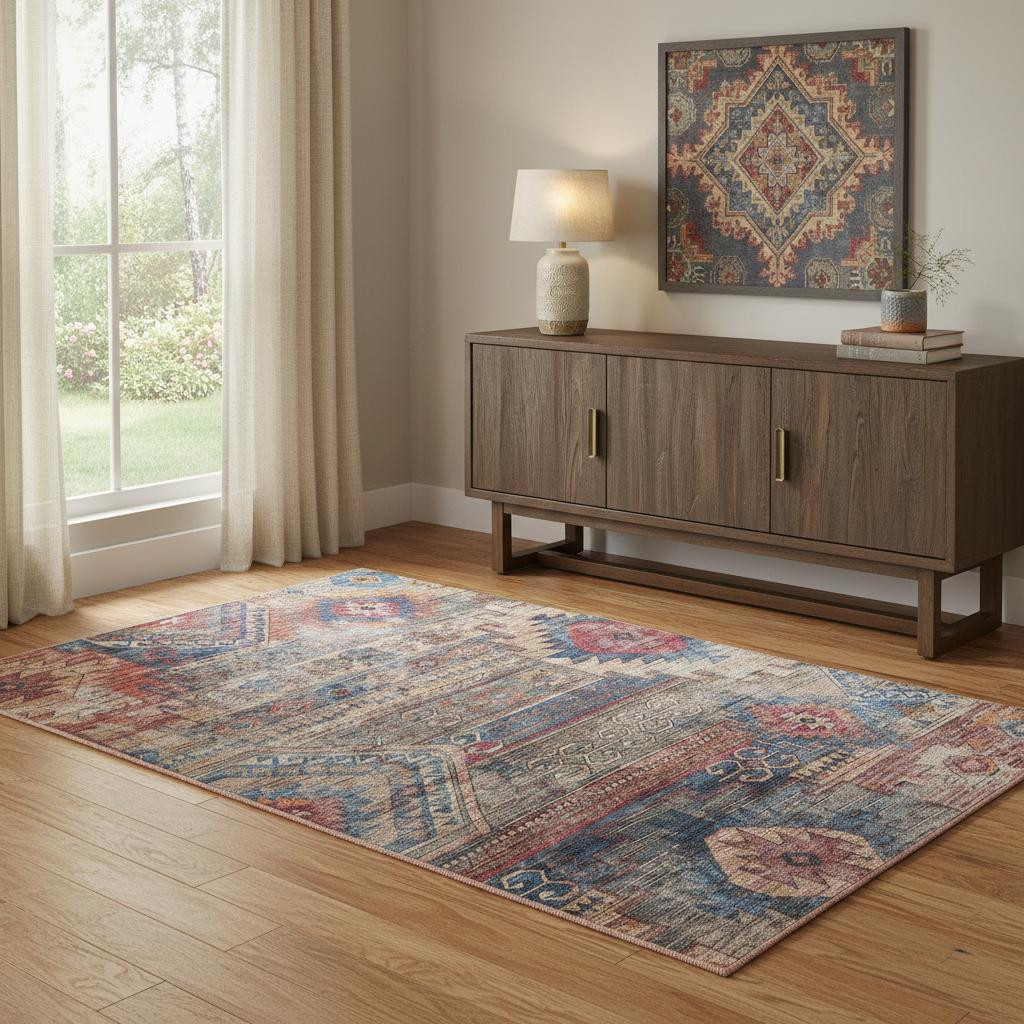 Add great coloration and comfortable texture to your space with this 4' x 6' multicolor southwestern power loom distressed washable area rug. This rectangle shaped rug features a southwestern design in multicolor to give it visual interest. A classic shape marries with good looking design for your space This rug infuses a delightfully festive and vibrant coloration to your space. This superior Turkish rug represents the highest quality and is built to last. Place this area rug against a hardwood or tile floor and it will enliven your living space with style and sophistication. .28" H x 48.00" W x 72.00" D