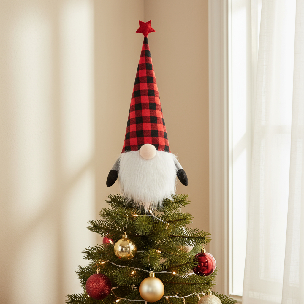 Dress your tree in festive style with this adorable Red And Black Felt And Faux Fur Gnome Adjustable Height Tree Topper. This checkered hat fuzzy beard gnome is all set and ready to help you ring in the holiday season with whimsy and chic style. In addition to being used as a stylish tree topper, this versatile accessory can be used as a decoration on your table, shelf, dresser, or mantle. 27.4-inch H x 9.5-inch W x 9.5-inch D