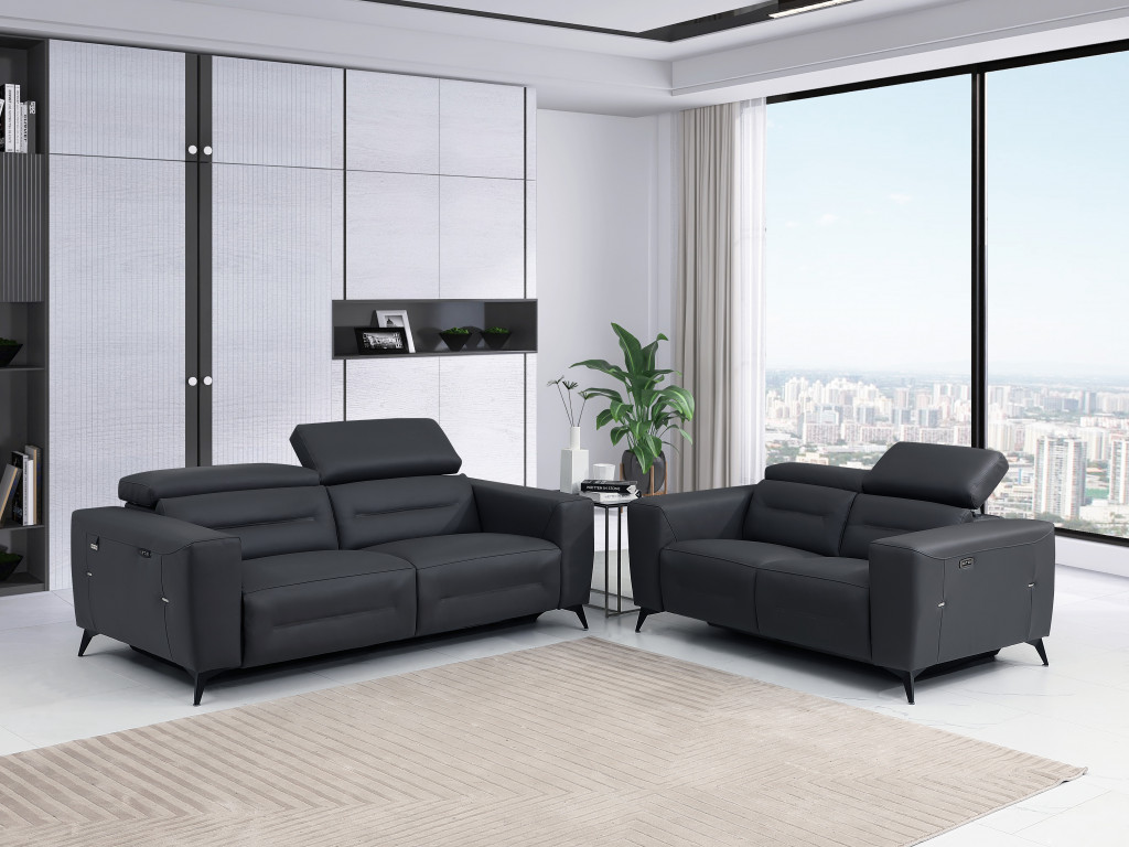 When it comes to indoor seating, this two piece indoor dark gray italian leather five person seating set has everything you need to get set and ready to relax. The reclining sofa will transform your space into a cozy haven for leisurely activities, movie nights, or even quick power naps. Elevate your living space with durable, comfortable, and luxurious leather upholstery. Coil spring seat construction provides excellent comfort by offering a responsive and supportive seating experience, gently contouring to the body's natural curves. The inclusion of a loveseat into your mix allows a fashionable seating option in a compact design. Gather with family and loved ones with this seating set that will bring you all together. 40-inch H x 82.4-inch W x 43-inch D