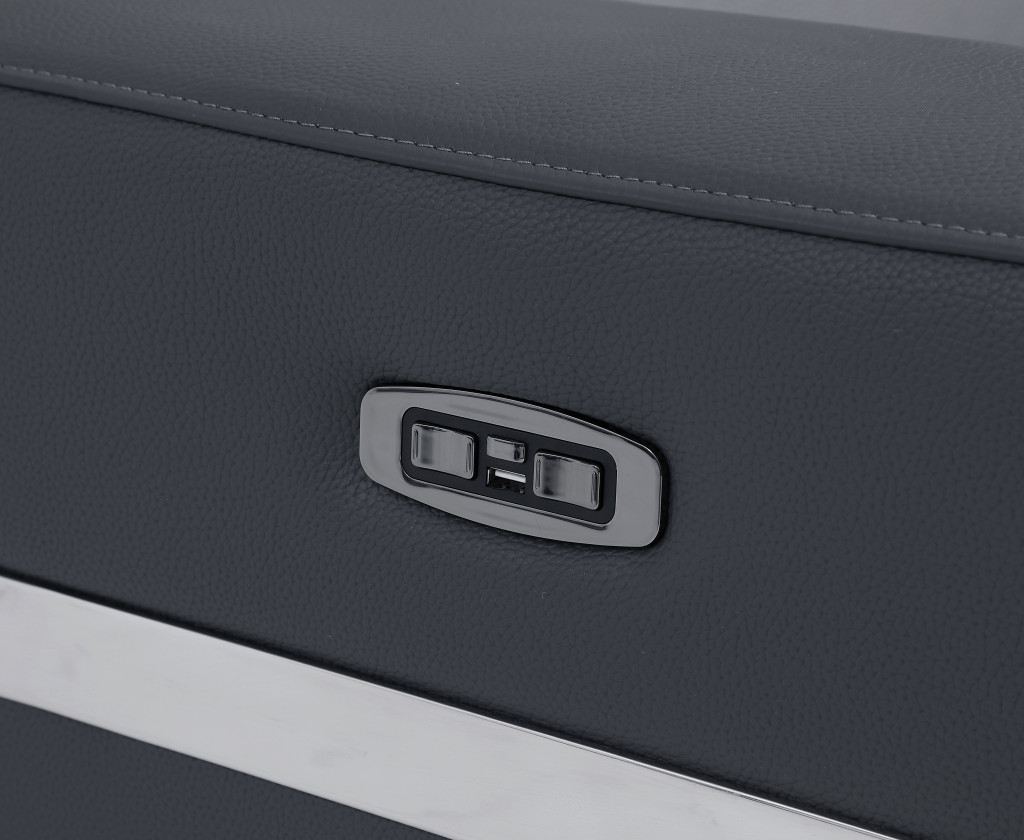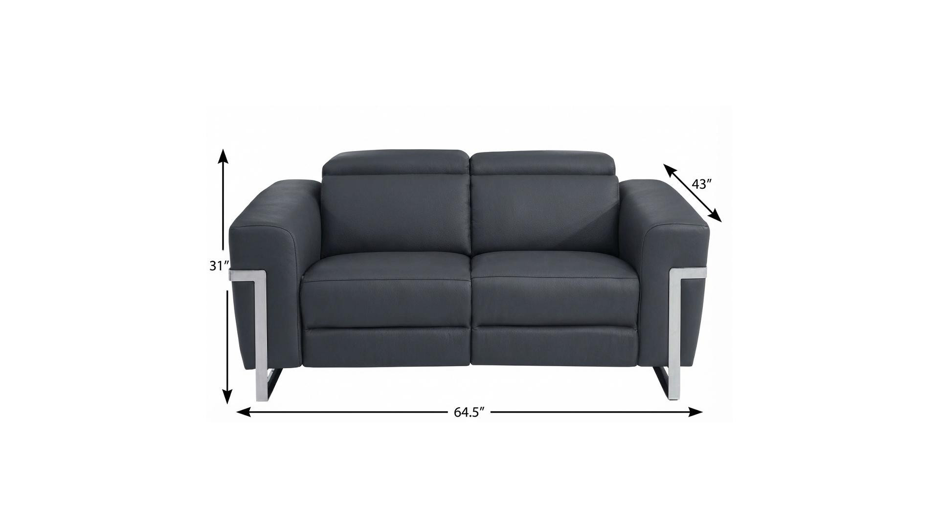 An interior designer's dream, this buttery soft high grade leather 65-inch gray and silver italian leather power reclining loveseat will bring just the right touch to your space. The high grade premium leather used makes your lounging luxuriously comfortable and adds an elegant appeal to your space. Square arms offer a comfy place to rest and give this piece some interest and shape. Silver metal legs effortlessly elevate the room and add a touch of contemporary design. A great showpiece for your room, this sofa is a must have. 31-inch H x 64.5-inch W x 43-inch D