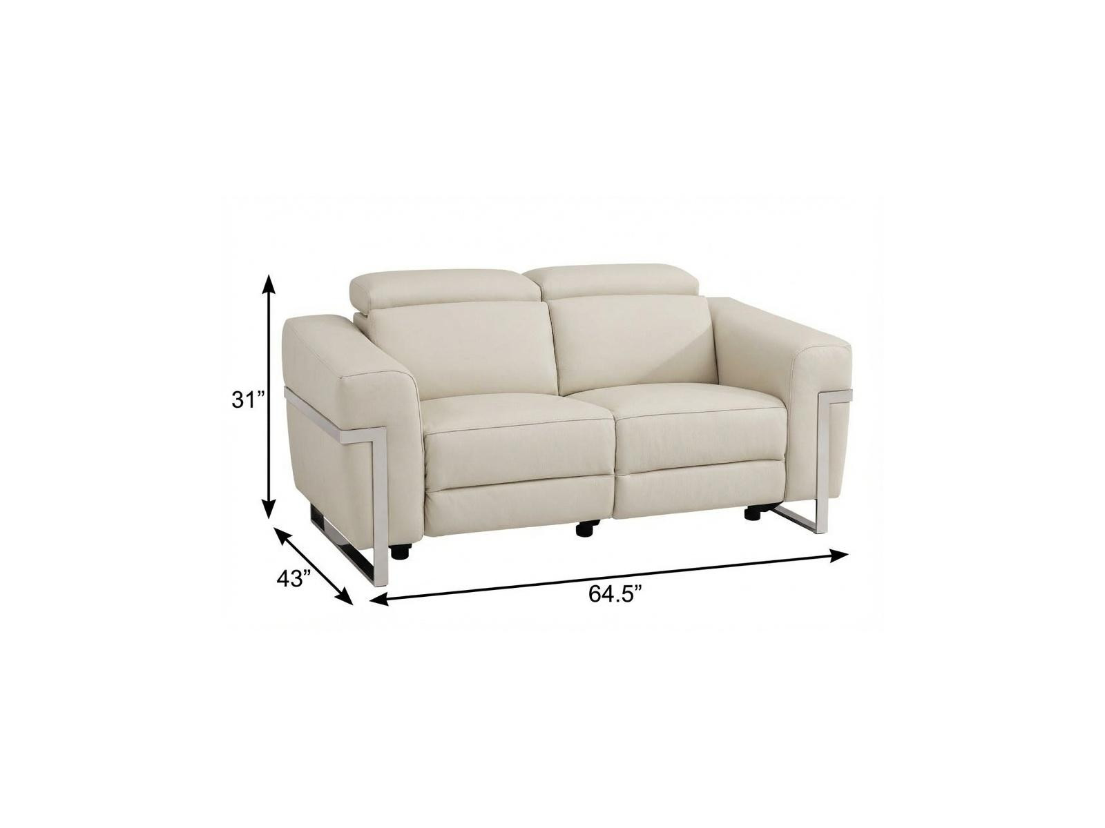 An interior designer's dream, this buttery soft high grade leather 65-inch beige and silver italian leather power reclining loveseat will bring just the right touch to your space. The high grade premium leather used makes your lounging luxuriously comfortable and adds an elegant appeal to your space. Square arms offer a comfy place to rest and give this piece some interest and shape. Silver metal legs effortlessly elevate the room and add a touch of contemporary design. A great showpiece for your room, this sofa is a must have. 31-inch H x 64.5-inch W x 43-inch D