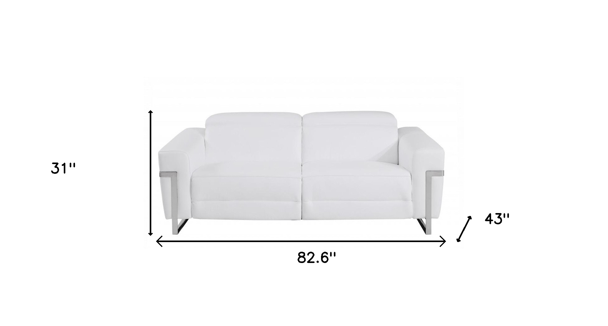 Superior construction from fabulously soft and high grade leather gives this 83-inch white italian leather usb reclining sofa with chrome legs a leg up on the competition. The premium leather used makes your lounging luxuriously comfortable and adds an elegant appeal to your space. Solid colors give you lots of decorative options and are easy to work into your decor scheme. Sinuous springs construction gives this piece strong support and makes it comfortable to sit even for long periods of time. Square arms offer a comfy place to rest. Chrome stainless steel legs effortlessly elevate the room and add a touch of contemporary design. A great showpiece for your room, this sofa is a must have. 31-inch H x 83-inch W x 43-inch D