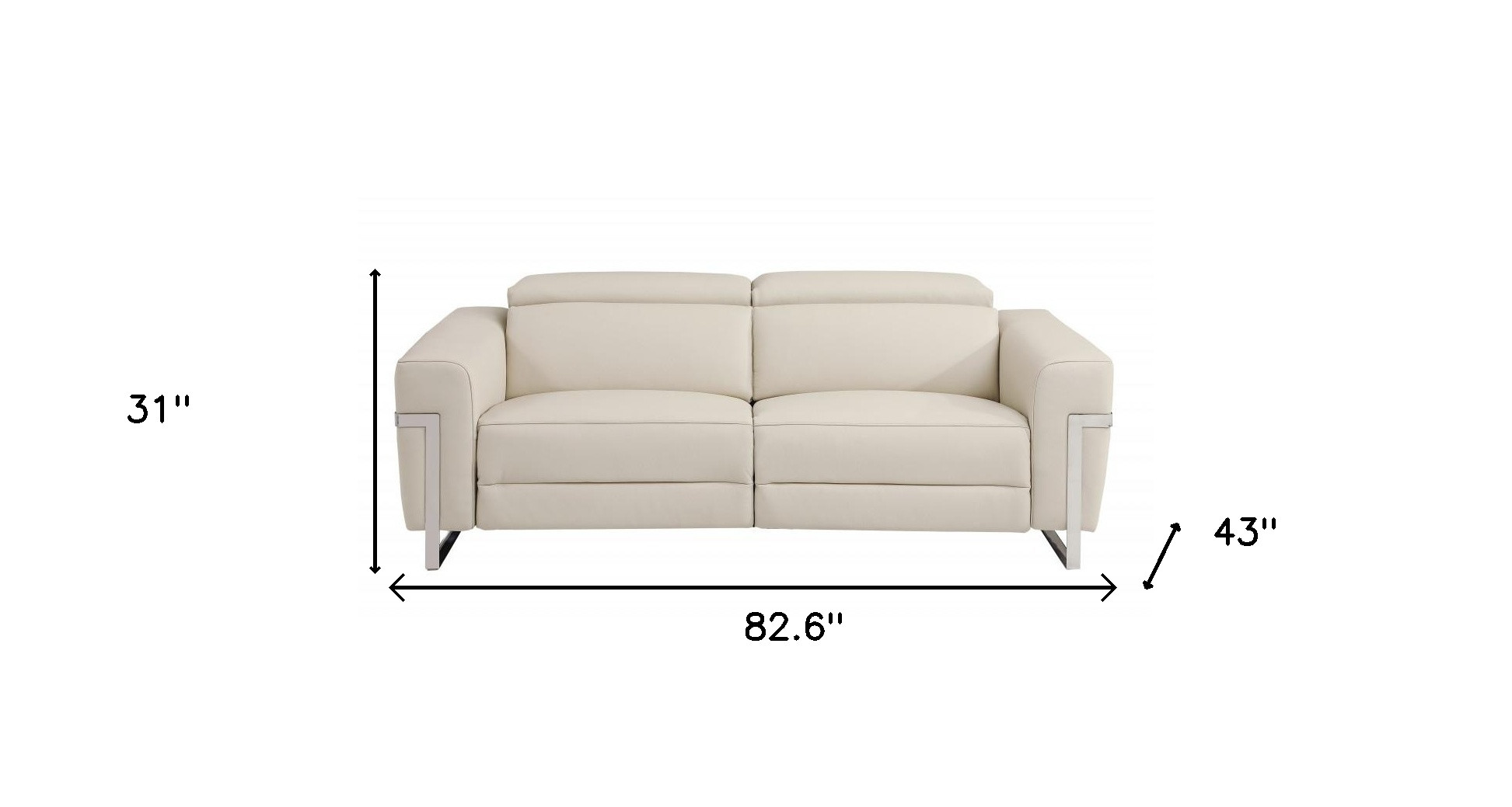 Made of the highest quality, supple leather, this 83-inch beige italian leather usb reclining sofa with silver legs will be the star of your space. The high grade premium leather used makes your lounging luxuriously comfortable and adds an elegant appeal to your space. Solid colors give you lots of decorative options and are easy to work into your decor scheme. Sinuous springs construction gives this piece strong support and makes it comfortable to sit even for long periods of time. Square arms offer a comfy place to rest. Silver stainless steel legs effortlessly elevate the room and add a touch of contemporary design. Built to last, this sofa will be a great centerpiece for your room. 31-inch H x 83-inch W x 43-inch D