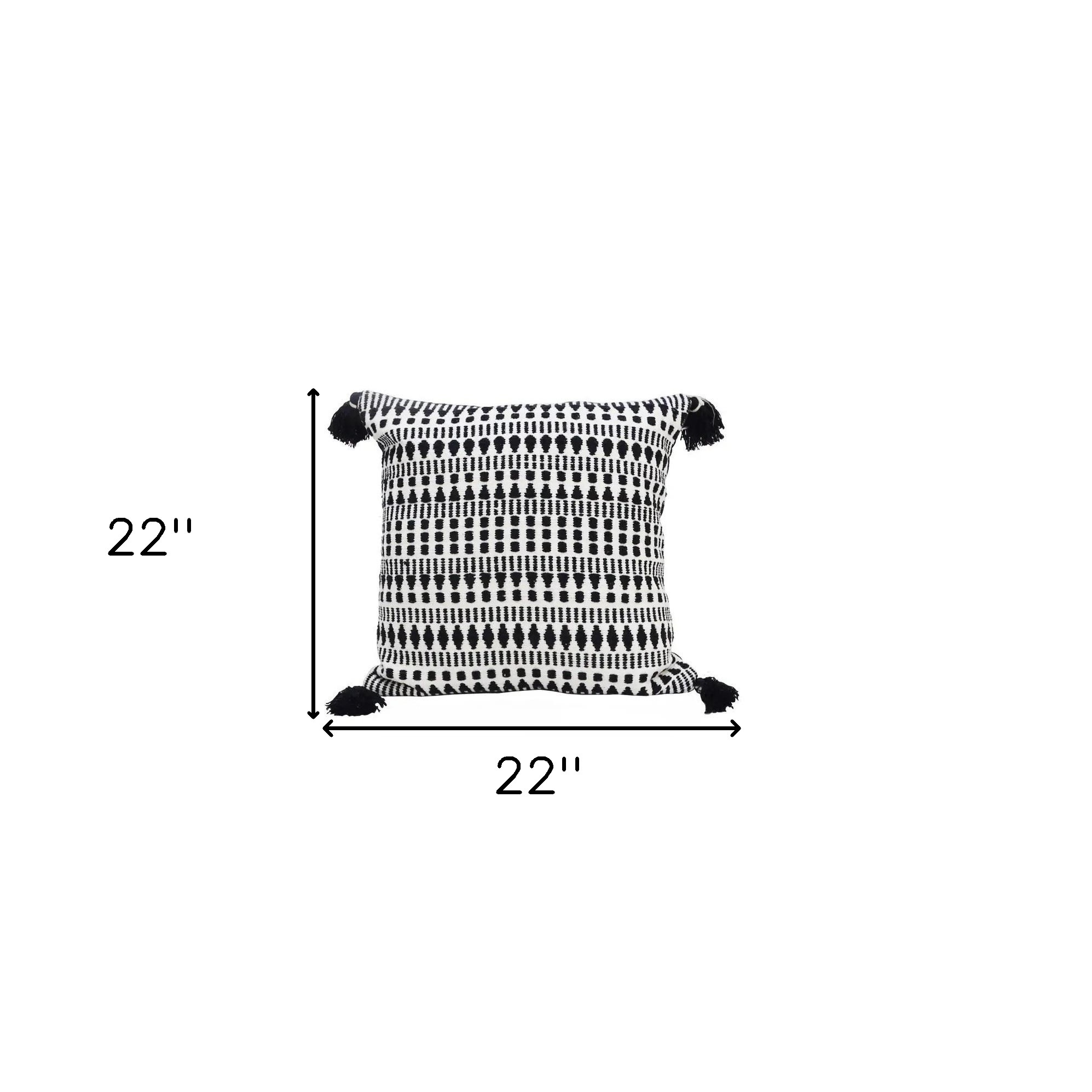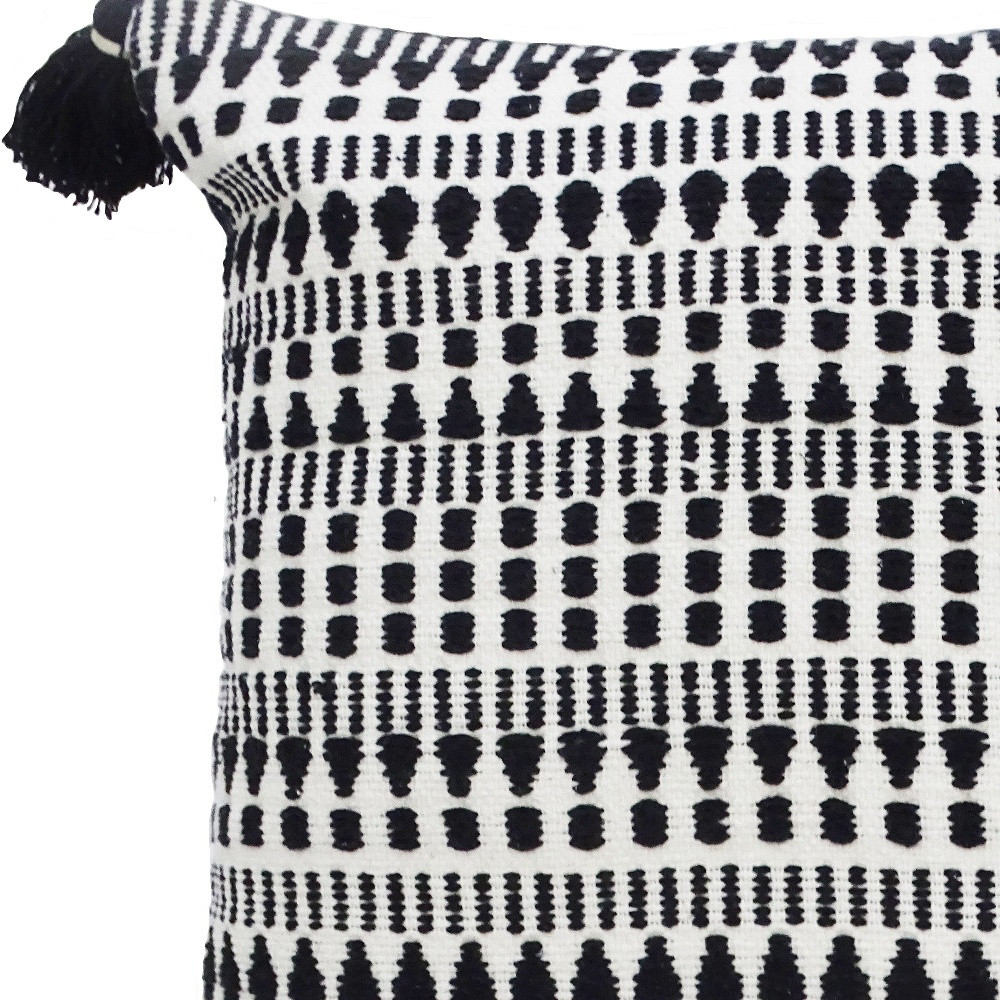 The 22-inch black and white southwestern cotton blend throw pillow with tassels is the perfect decorative accessory for your home. This black and white hued piece represents quality construction, expertly made from durable cotton blend that is not only long lasting but soft to the touch as well. Fun and decorative tassels add some high end and hand-crafted textural designer touches. This soft polyester filled pillow not only is decorative but made to be comfy and cozy all day long. Decorative throw pillows not only add color and dimension to your space but can be comfy and supportive when you are lounging and cuddling as well. Decorative pillows are a great way to change up the look and feel of your space easily and quickly. 22-inch H x 22-inch W x 10-inch D