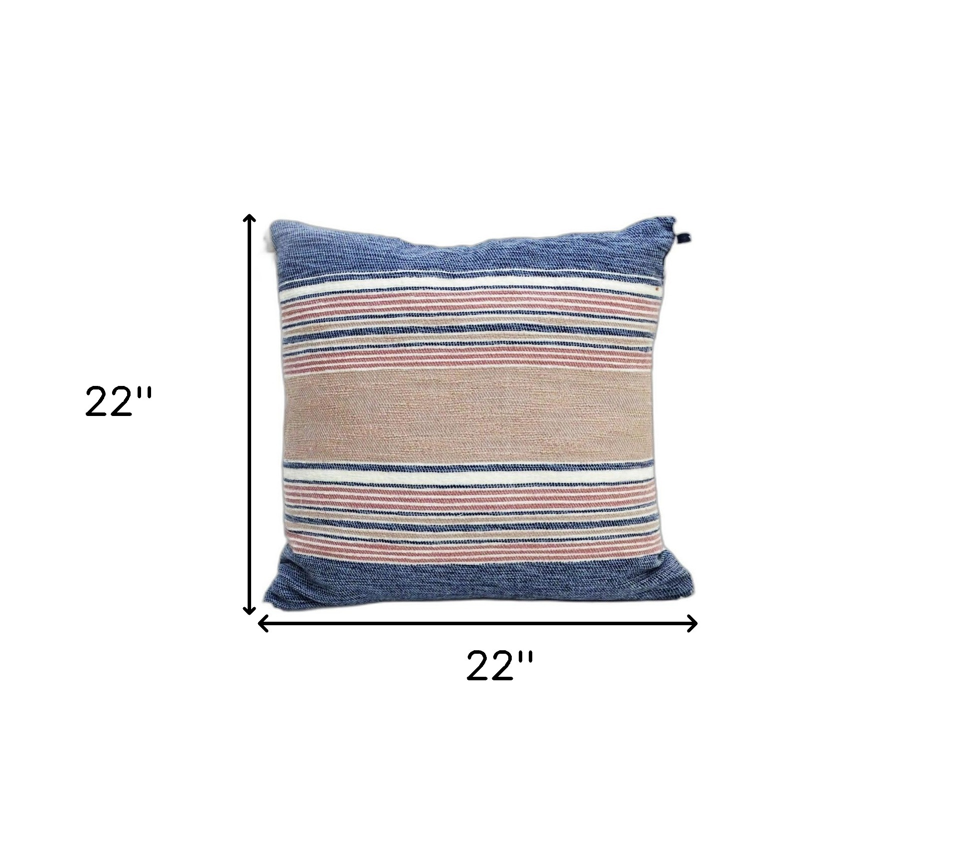 Add an air of fashion to your room and rejuvenate the space with this cute and fashionable 22" x 22" blue and tan striped zippered handmade cotton blend throw pillow with tassels. Fun and decorative tassels add some high end and hand-crafted textural designer touches. Decorative throw pillows not only add color and dimension to your space but can be comfy and supportive when you are lounging and cuddling as well. Decorative pillows are a great way to change up the look and feel of your space easily and quickly. 10" H x 22" W x 22" D