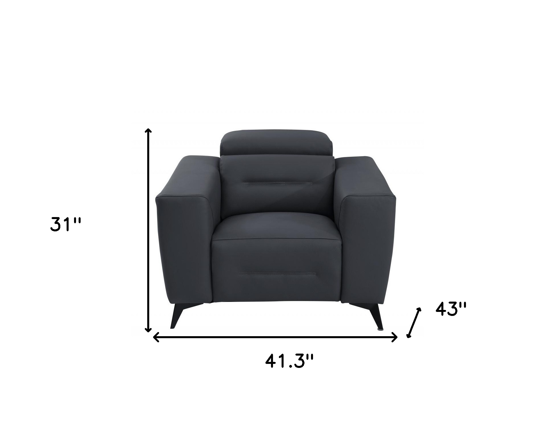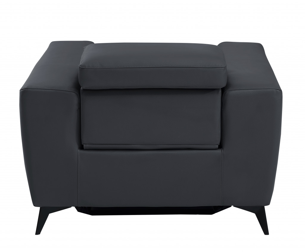 Kick back and relax in this 41" dark gray italian leather power recliner while you're reading a novel or watching your favorite TV show. Upholstered in high grade, italian leather, this chair will provide a soft and luxurious way for you to relax and rest. Whether you are starting your day, ending your day, or sneaking in a cat nap in between, this chair is a welcome addition to your space and self-care routine. Take relaxation to the next level with this comfy reclining chair. 31" H x 41.3" W x 43" D