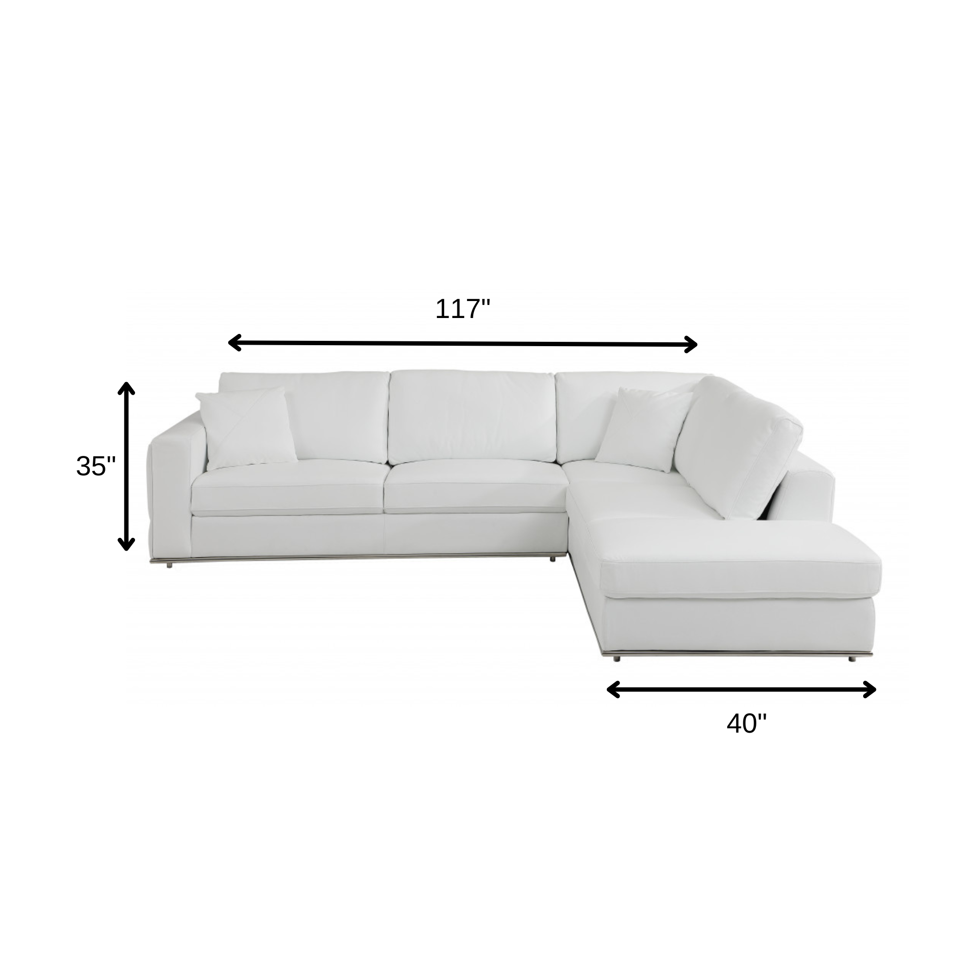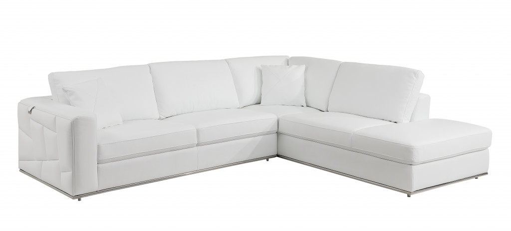 Made of the highest quality, supple leather, this white italian leather reclining l shaped two piece corner sectional will be the star of your space. The high-grade premium leather used makes your lounging luxuriously comfortable and adds an elegant appeal to your space. Solid colors give you lots of decorative options and are easy to work into your decor scheme. Square arms offer a comfy place to rest. Silver metal legs effortlessly elevate the room and add a touch of contemporary design. Great for everyday lounging and for entertaining, sectionals are an ideal way to seat multiple people. 35-inch H x 117-inch W x 40-inch D