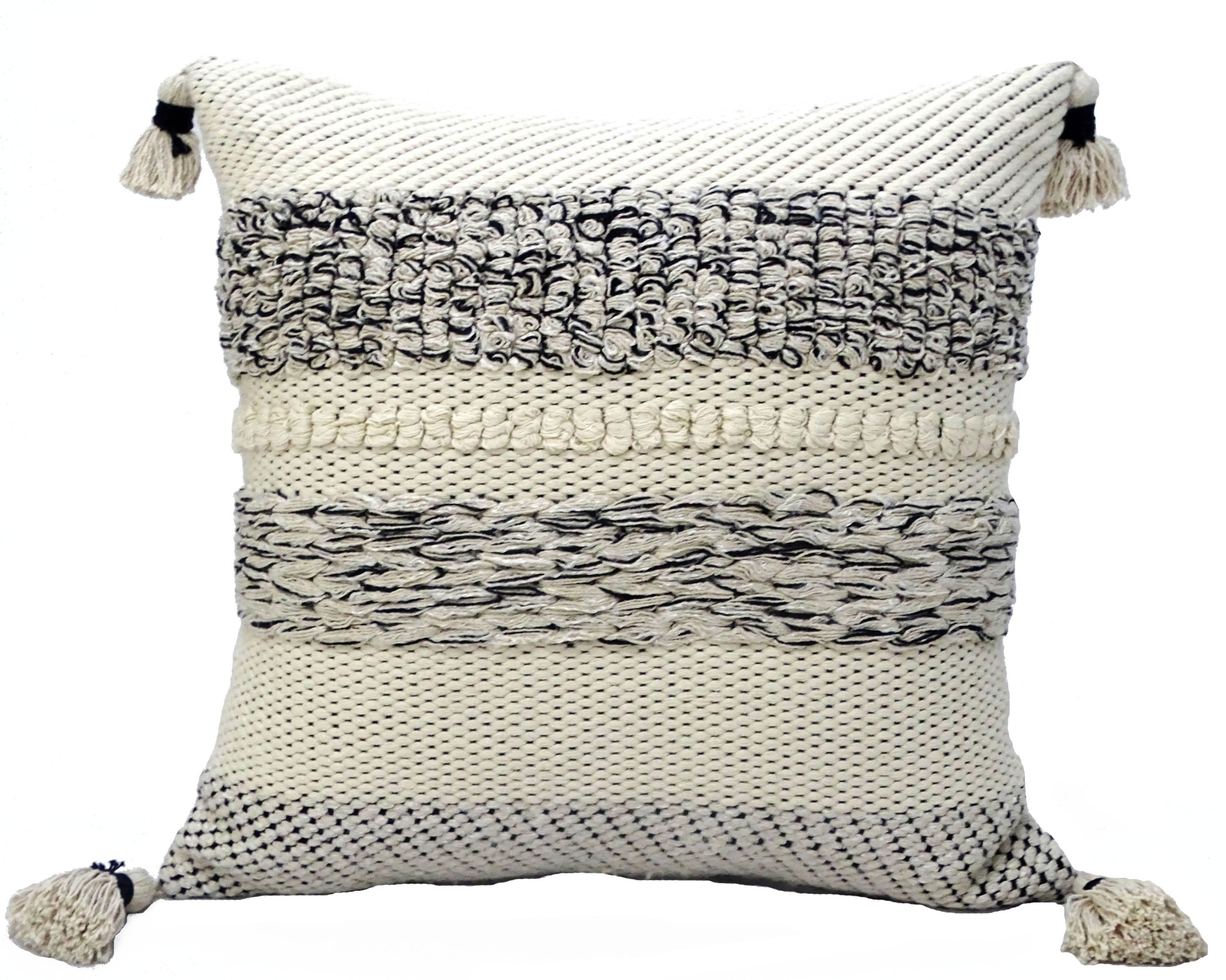 Unique and decorative, this comfortable 22" x 22" white and black zippered cotton blend ribbed throw pillow with tassels will leave a lasting impression. Fun and decorative tassels add some high end and hand-crafted textural designer touches. Decorative throw pillows not only add color and dimension to your space but can be comfy and supportive when you are lounging and cuddling as well. A great decorative accessory for your favorite chair, to accent your sofa, or to use as part of your bed ensemble. 10" H x 22" W x 22" D
