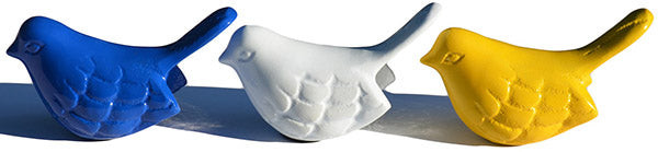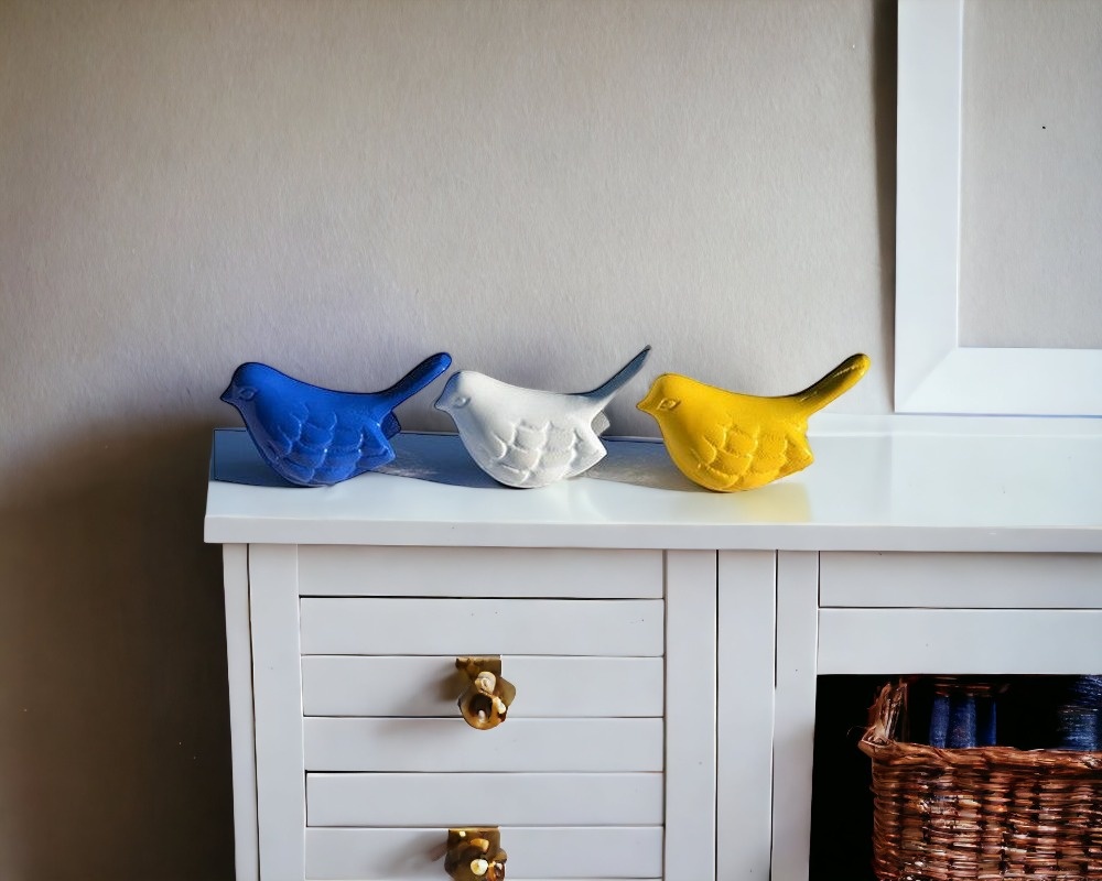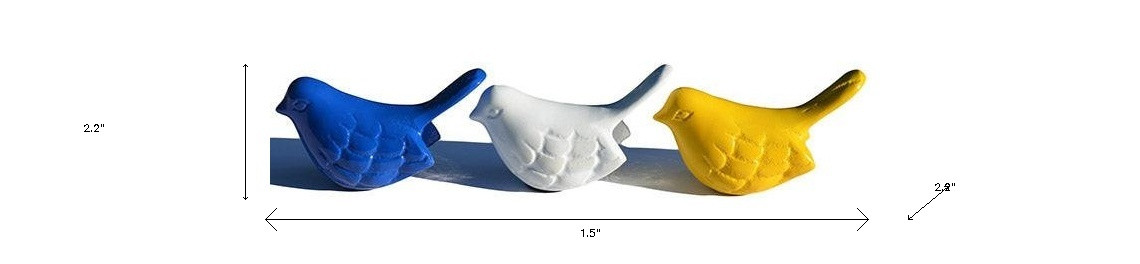 Bring some sizzle to your space with this eye-catching set of three blue and yellow metal bird tabletop sculpture. This pretty bird brings a touch of elegance and some outdoor beauty to your space. A perfect decorative addition for anyone who loves a stylish look and feel. 2.20-inch h x 1.50-inch w x 2.20-inch d.
