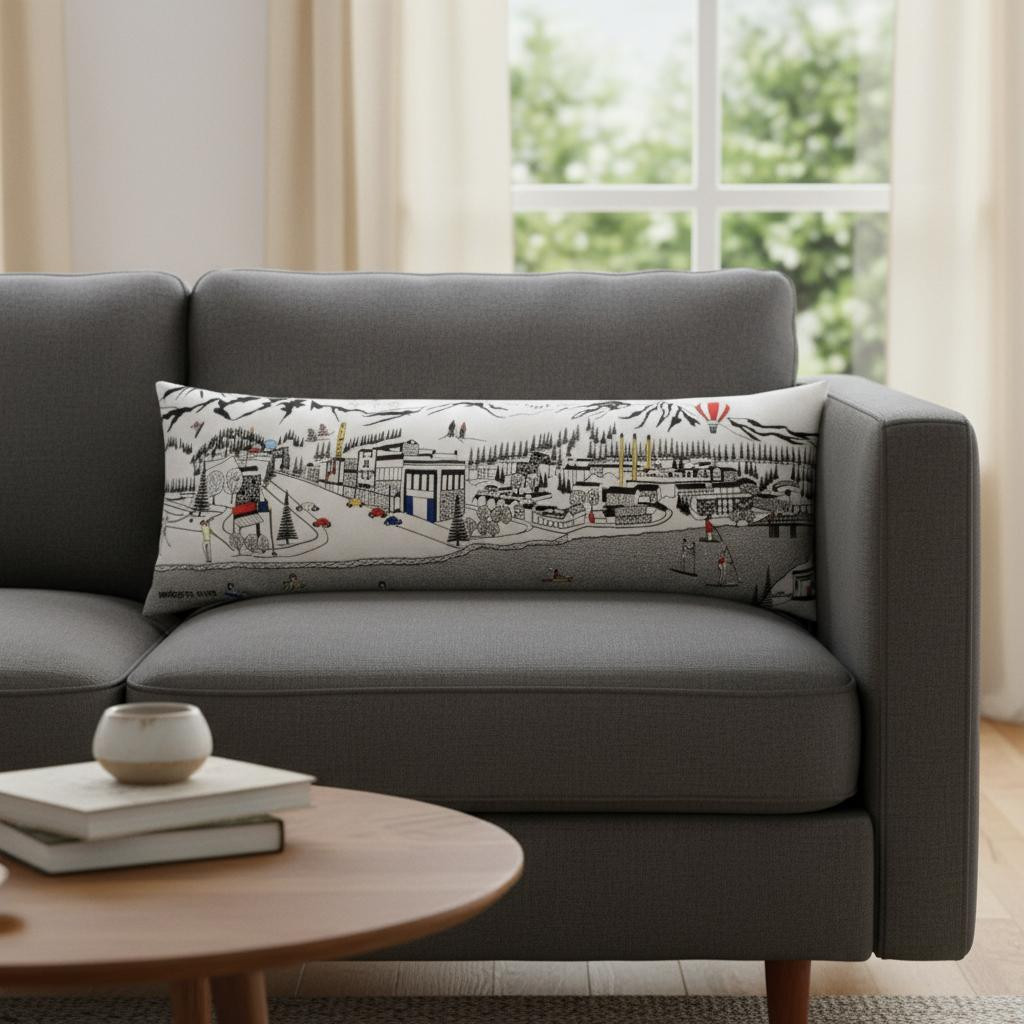 Showcase this famous city, with our Bend Daylight Skyline Lumbar Decorative Pillow. The daylight view of Bend from the mighty Deschutes River that runs through it, is picture perfect. The gorgeous art features many famous landmarks and references for this destination city, rendering a modern whimsical way to bring this iconic cityscape to life. Made of a wool/nylon blend, this high quality stitched decorative pillow features embroidered artwork mixed with pops of color that highlight important and recognizable icons from this popular Oregon city. This pillow makes a great gift, decorative accent and conversation piece. 14-inch H x 46-inch W x 4-inch D