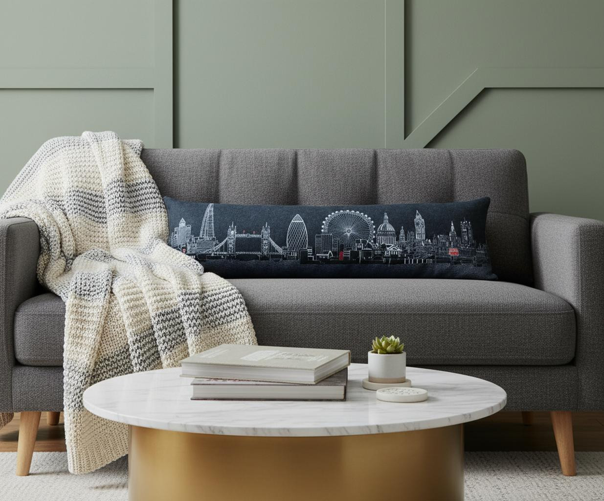 Showcase one of the most famous cities in the world with our London Skyline Lumbar Decorative Pillow. This night view of London is one of the most famous landscapes in the world. The gorgeous art features famous architecture and landmarks including Big Ben and The London Eye, rendering a modern whimsical way to bring this iconic cityscape to life. Made of a wool/nylon blend, this high quality stitched decorative pillow features embroidered artwork mixed with pops of color that highlight important and recognizable icons from this fabulous city. This pillow makes a great gift, decorative accent and conversation piece. 14-inch H x 45-inch W x 4-inch D