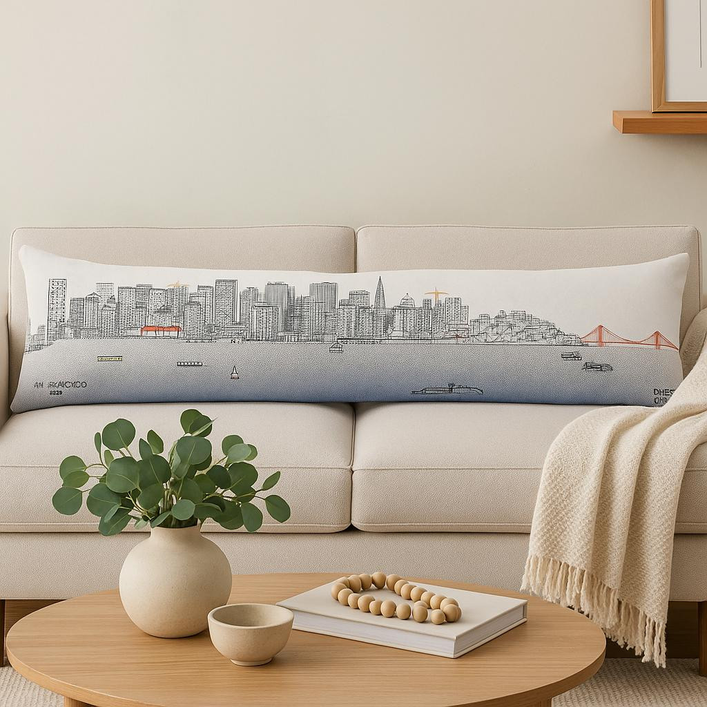 Showcase one of the most famous cities in the world with our San Francisco Daylight Skyline Lumbar Decorative Pillow. The daylight view of San Fran from the Bay is one of the most famous landscapes in the world. The gorgeous art features many famous landmarks including the Golden Gate Bridge, rendering a modern whimsical way to bring this iconic cityscape to life. Made of a wool/nylon blend, this high quality stitched decorative pillow features embroidered artwork mixed with pops of color that highlight important and recognizable icons from this fabulous city. This pillow makes a great gift, decorative accent and conversation piece. 14-inch H x 46-inch W x 4-inch D