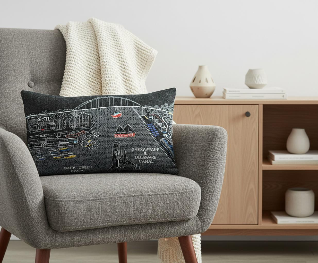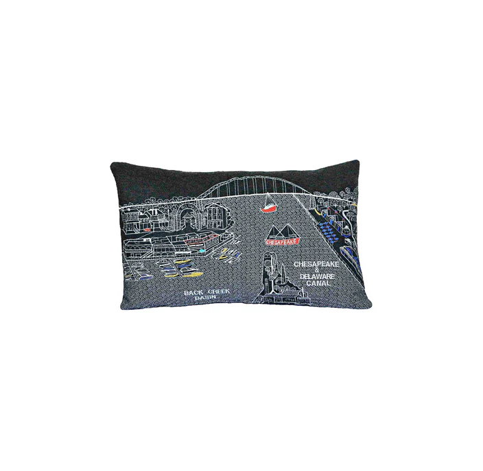 Showcase this famous city, with our Chesapeake City Nighttime Skyline Lumbar Decorative Pillow. The Nighttime view of the Chesapeake and Delaware Canal, is picture perfect. The gorgeous art features many famous landmarks and references to the area's important commercial canal, rendering a modern whimsical way to bring this iconic cityscape to life. Made of a wool/nylon blend, this high quality stitched decorative pillow features embroidered artwork mixed with pops of color that highlight important and recognizable icons from this popular Maryland destination. This pillow makes a great gift, decorative accent and conversation piece. 14-inch H x 25-inch W x 4-inch D