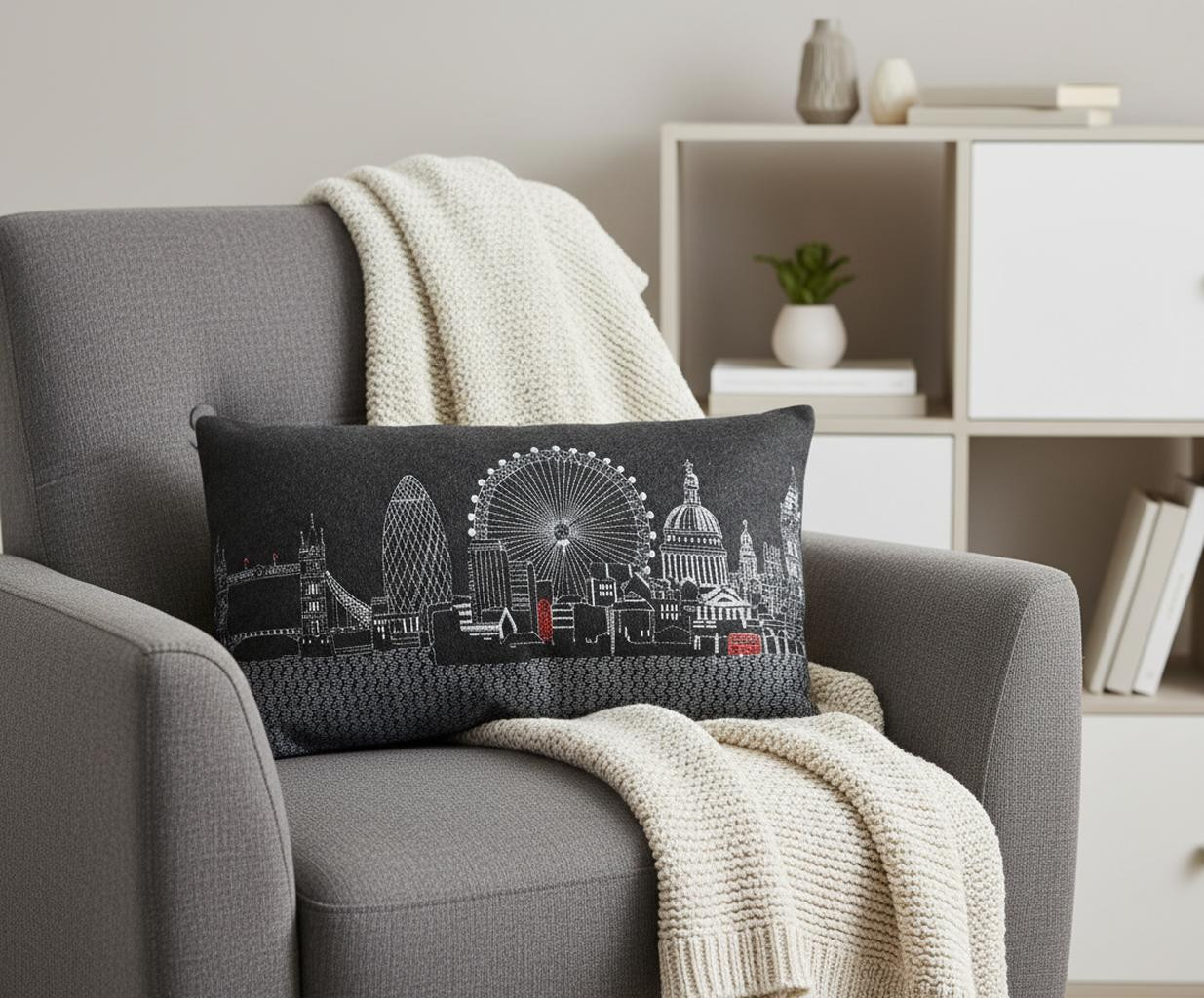 Showcase one of the most famous cities in the world with our London Skyline Lumbar Decorative Pillow. This night view of London is one of the most famous landscapes in the world. The gorgeous art features famous architecture and landmarks including Big Ben and The London Eye, rendering a modern whimsical way to bring this iconic cityscape to life. Made of a wool/nylon blend, this high quality stitched decorative pillow features embroidered artwork mixed with pops of color that highlight important and recognizable icons from this fabulous city. This pillow makes a great gift, decorative accent and conversation piece. 14-inch H x 24-inch W x 4-inch D