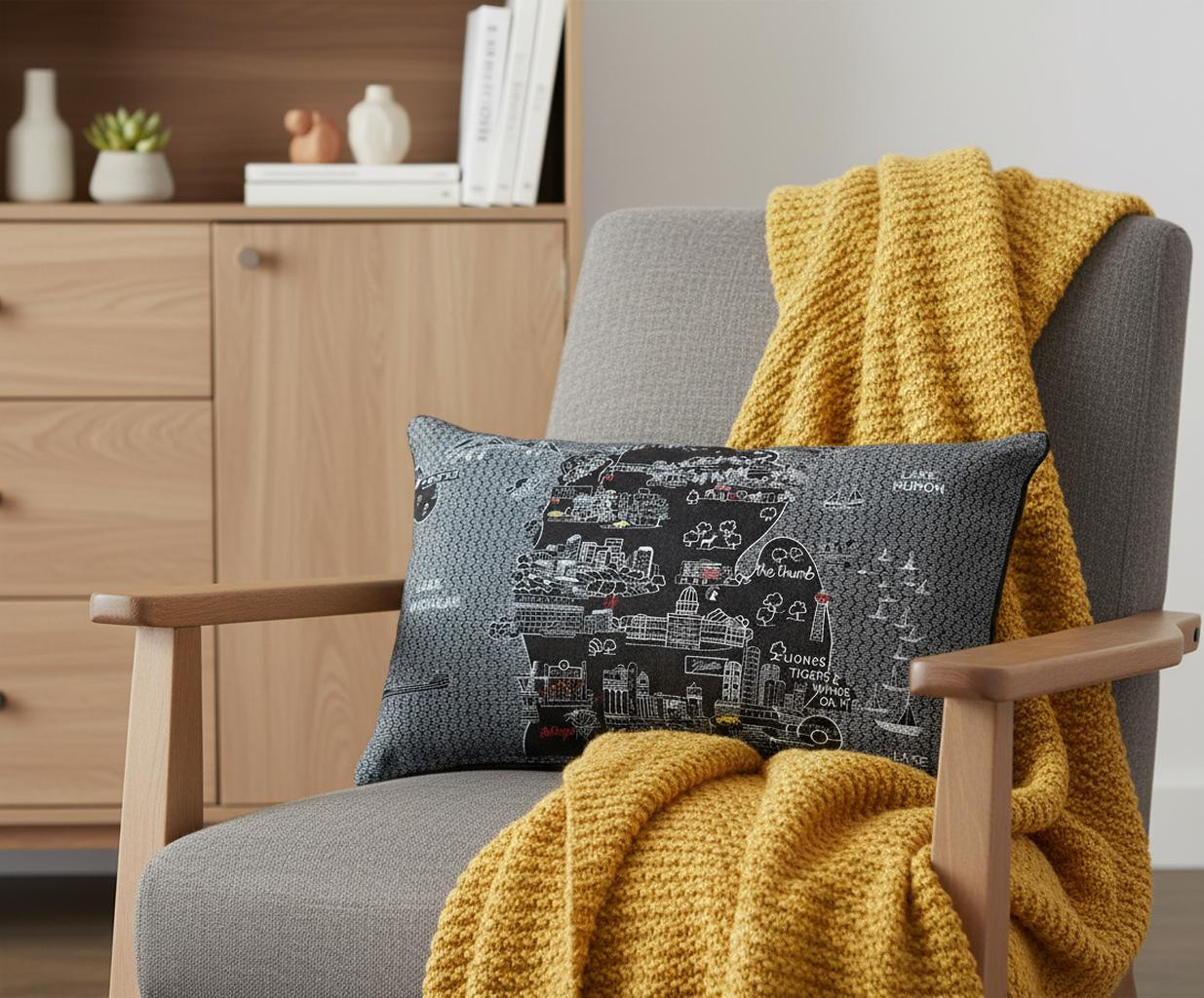 Showcase one of the greatest and most beloved states, with our Michigan Lower Peninsula Skyline Lumbar Decorative Pillow. This night view of the wonderful mitten and Lower Peninsula surrounded by their famous lakes is a stunning way to represent this great state. The gorgeous art features famous references and landmarks rendering a modern whimsical way to bring this iconic state to life. Made of a wool/nylon blend, this high quality stitched decorative pillow features embroidered artwork mixed with pops of color that highlight important and recognizable icons from this fabulous city. This pillow makes a great gift, decorative accent and conversation piece.14-inch H x 24-inch W x 4-inch D
