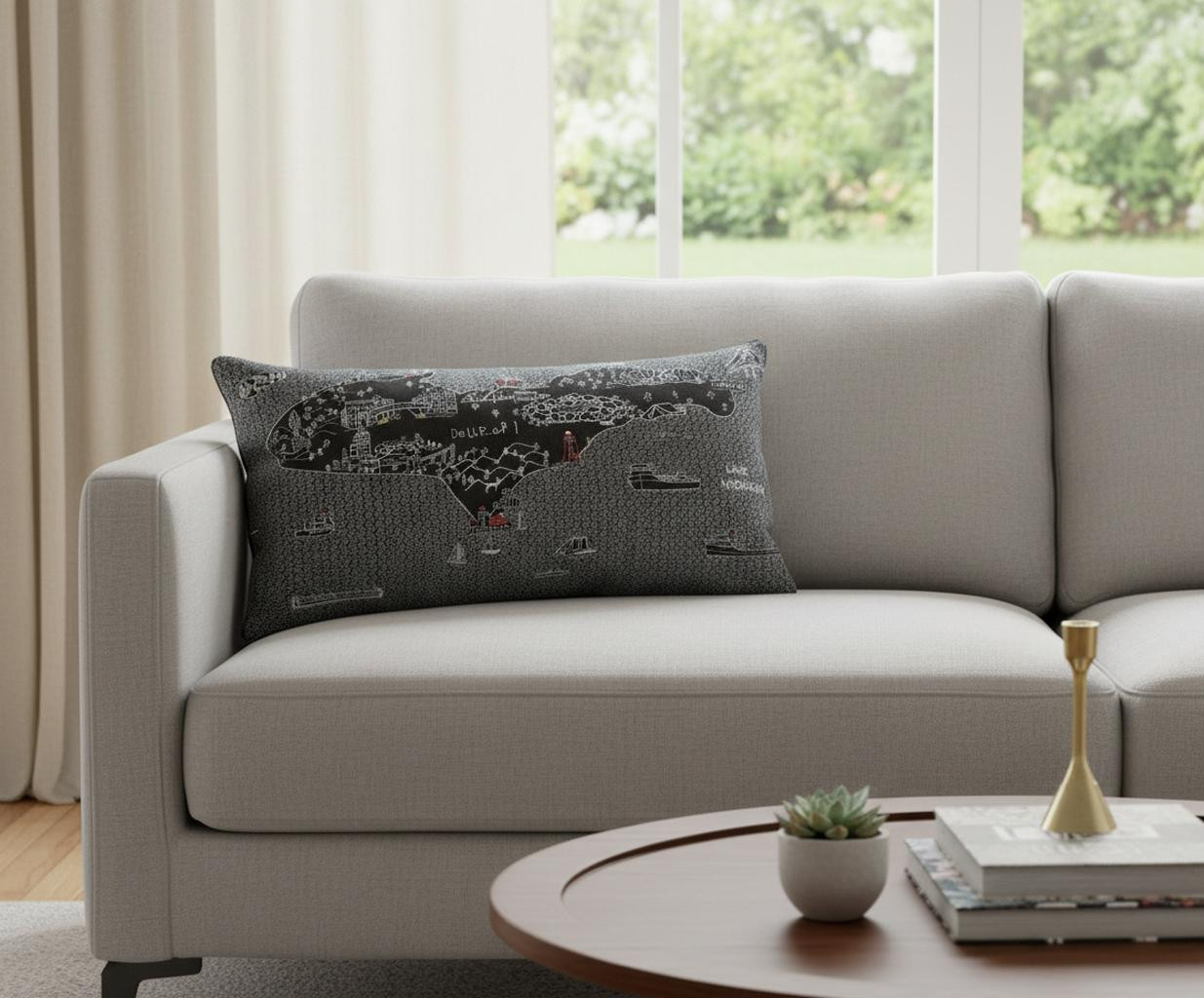 Showcase one of the greatest and most beloved states, with our Michigan Upper Peninsula Nighttime Skyline Lumbar Decorative Pillow. This Nighttime view of the wonderful mitten and Upper Peninsula surrounded by their famous lakes is a stunning way to represent this great state. The gorgeous art features famous references and landmarks rendering a modern whimsical way to bring this iconic state to life. Made of a wool/nylon blend, this high quality stitched decorative pillow features embroidered artwork mixed with pops of color that highlight important and recognizable icons from this fabulous city. This pillow makes a great gift, decorative accent and conversation piece. 14-inch H x 24-inch W x 4-inch D