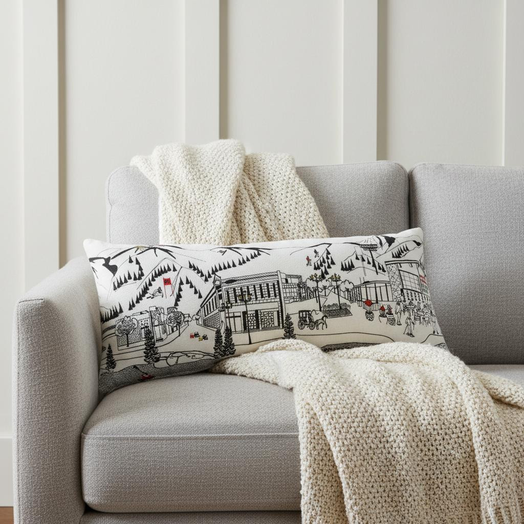 Showcase this famous city, with our Aspen Daylight Skyline Lumbar Decorative Pillow. The daylight view of Aspen from the Roaring Fork River is picture perfect. The gorgeous art features many famous landmarks and references for this destination city, rendering a modern whimsical way to bring this iconic cityscape to life. Made of a wool/nylon blend, this high quality stitched decorative pillow features embroidered artwork mixed with pops of color that highlight important and recognizable icons from this popular Colorado city known for its snow sports, fine dining, and resorts. This pillow makes a great gift, decorative accent and conversation piece. 14-inch H x 35-inch W x 4-inch D