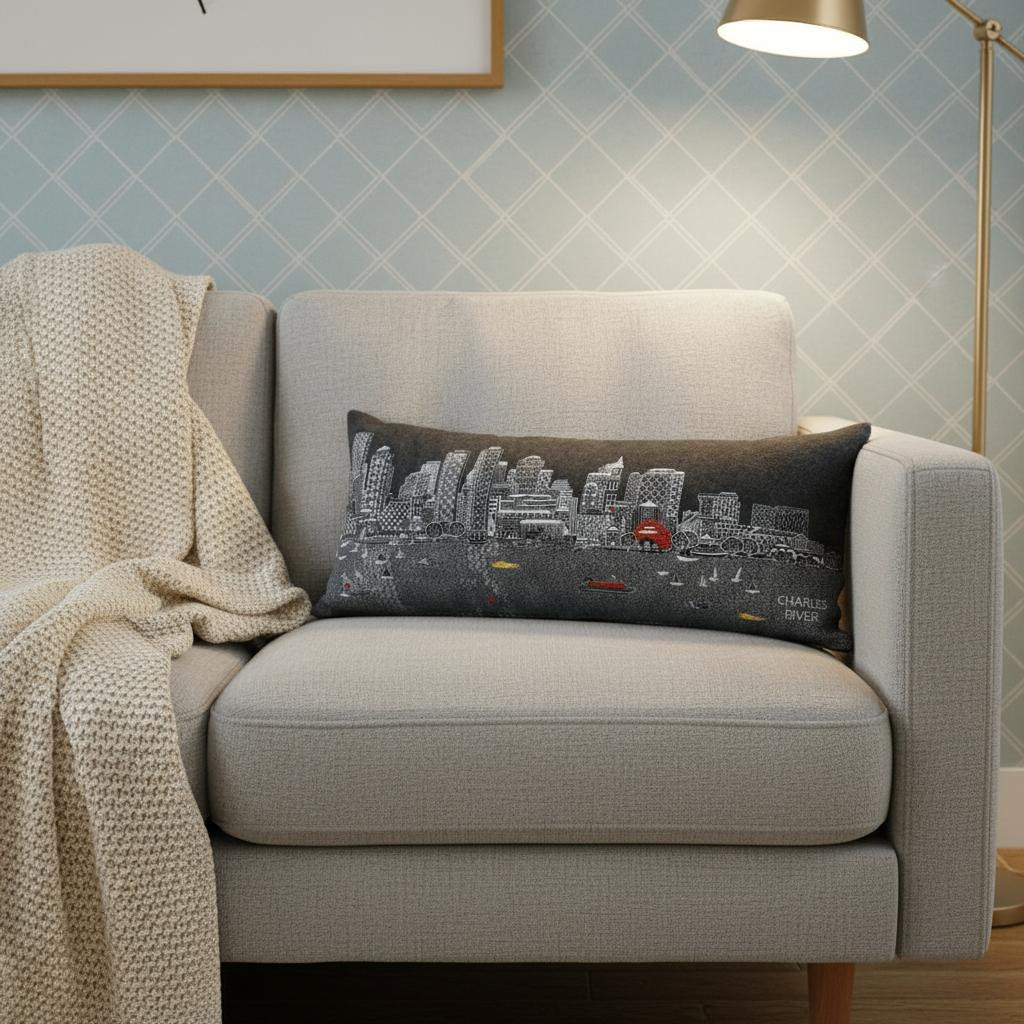 Showcase one of the most famous cities in the world with our Boston Skyline Lumbar Decorative Pillow. This Nighttime view of Boston Harbor from the Charles River is a stunning way to represent one of the most beloved and historical cities. The gorgeous art features famous architecture and landmarks including Big Ben and The London Eye, rendering a modern whimsical way to bring this iconic cityscape to life. Made of a wool/nylon blend, this high quality stitched decorative pillow features embroidered artwork mixed with pops of color that highlight important and recognizable icons from this fabulous city. This pillow makes a great gift, decorative accent and conversation piece. 14-inch H x 35-inch W x 4-inch D