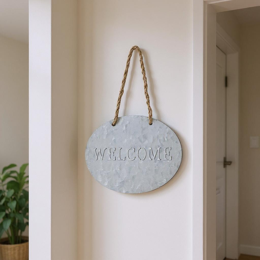 Add an air of fashion to your room and rejuvenate the space with this 5-inch x 8-inch gray handcrafted welcome galvanized metal wall decor. This rustic and crafty Welcome sign includes a rope for easy hanging. Hang on your wall to add some up to date fashion and decoration. 5.25-inch H x 7.75-inch W x 0.5-inch D