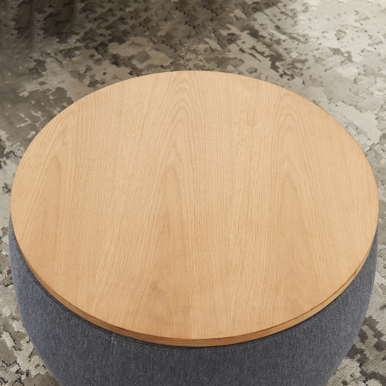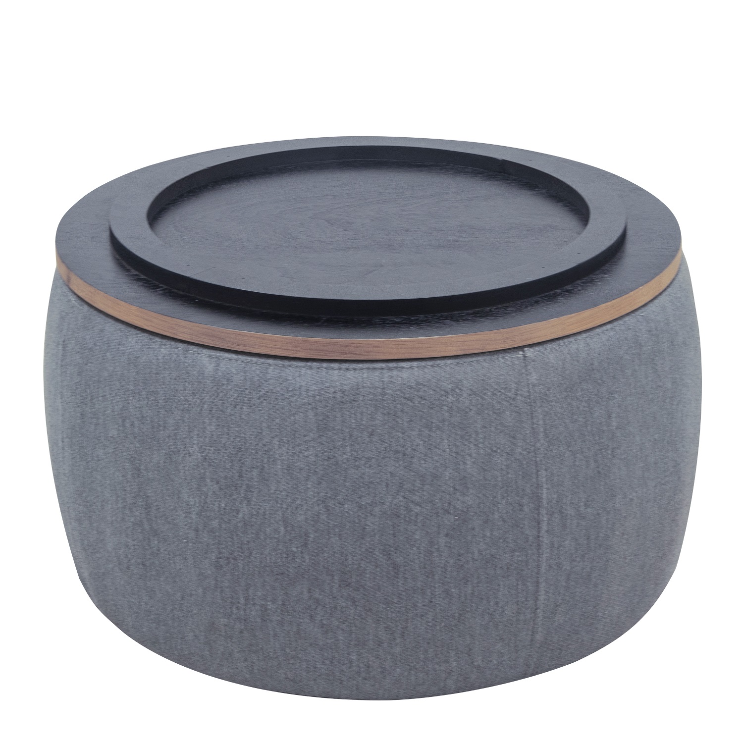 Practicality and fashion mix together with this handy 26-inch dark gray and natural fabric and wood reversible tray top round storage ottoman. Designed to discretely add hidden storage to your room without sacrificing seating or foot rest space. The manufactured wood top of this ottoman is a nice contrast to the upholstery material. Expertly upholstered with padding in a soft solid color polyester, this ottoman is as comfortable as it is good looking. Ottomans are multi-functional additions to your space that add fashion and practical value. 14.5-inch h x 25.5-inch w x 25.5-inch d.