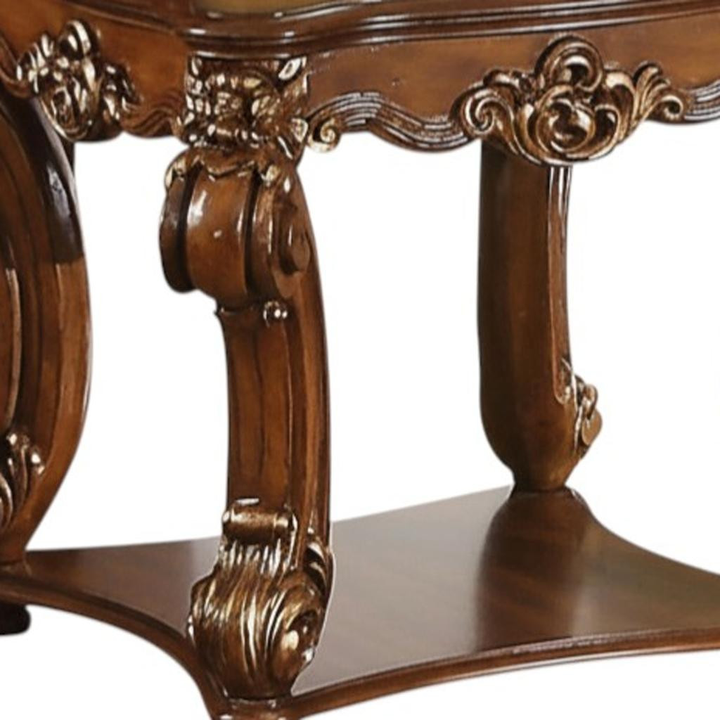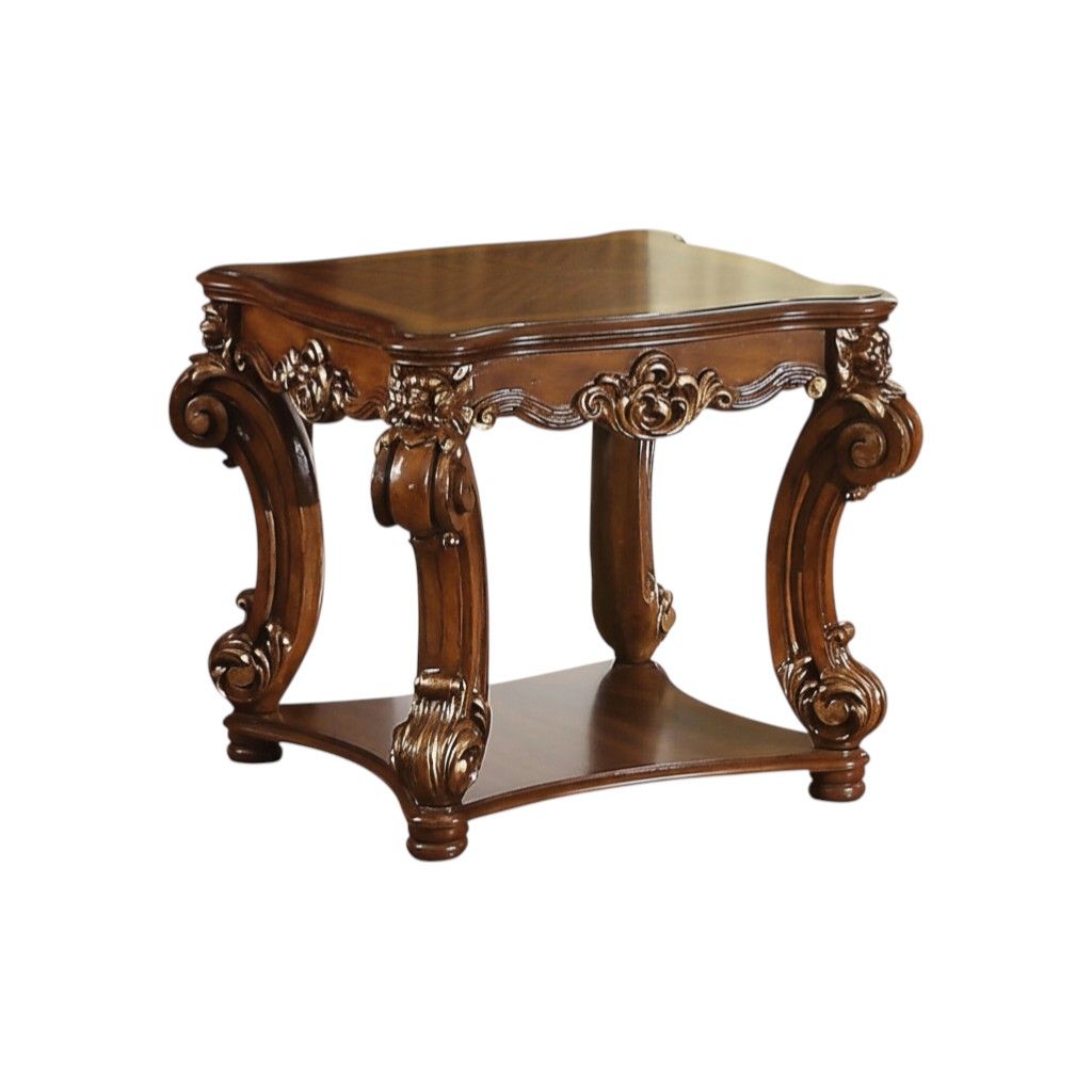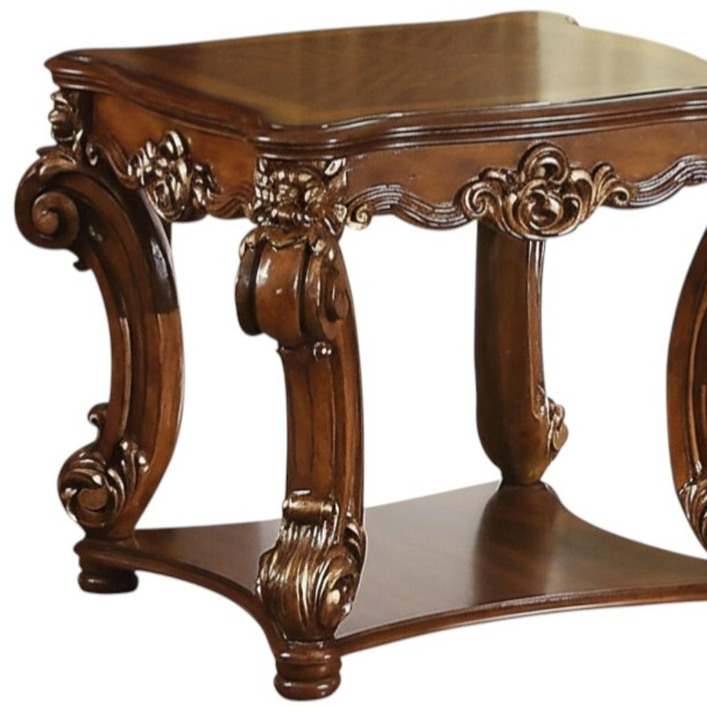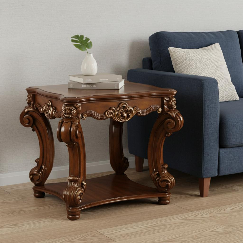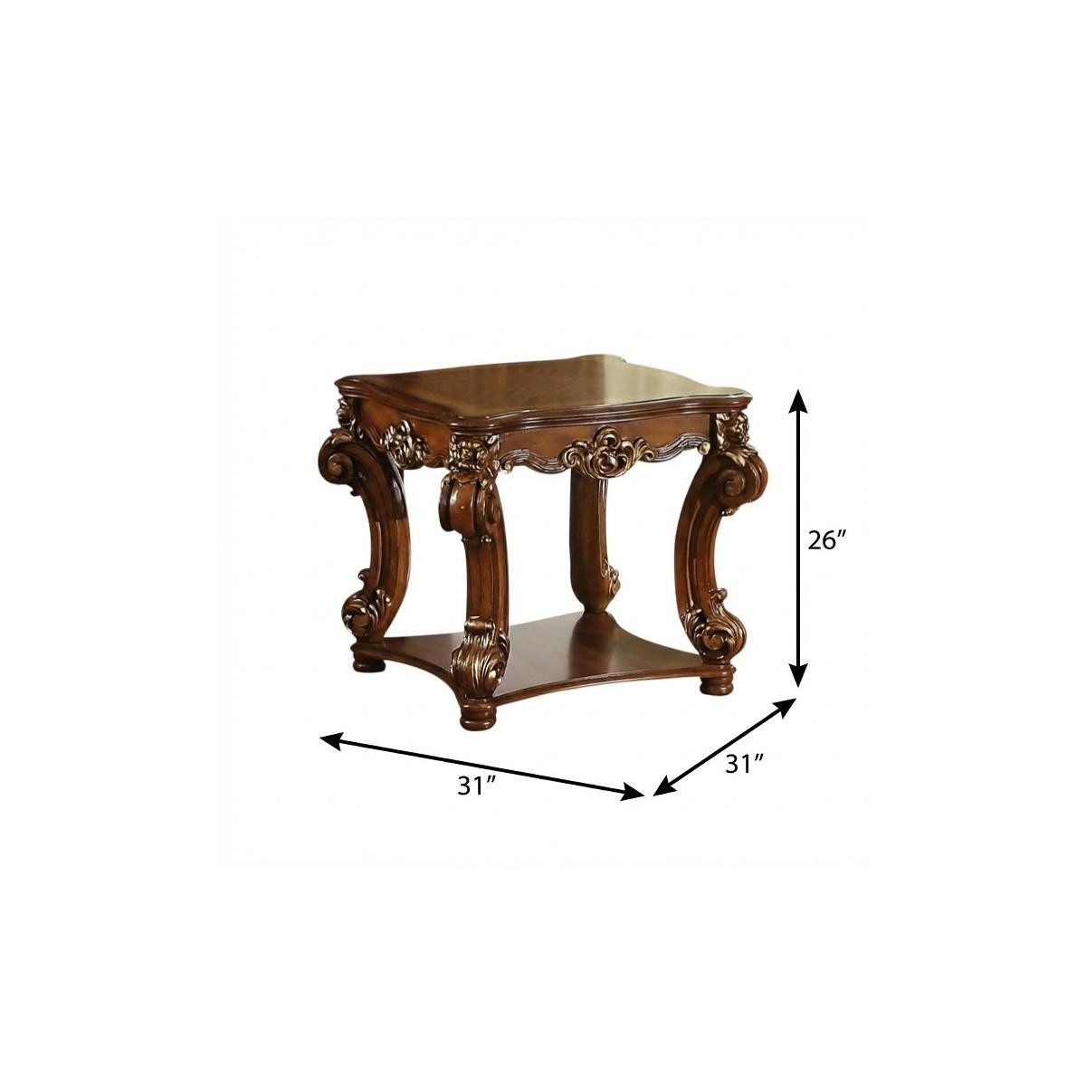 Show off your exquisite taste with this 26" scrolled cherry manufactured wood and solid wood square end table with shelf. This end or side table is expertly made from high quality solid wood. A sleek cherry monotone color gives this solid wood and manufactured wood table a fresh and updated look. Includes a single shelf for handy storage or display space. An ideal location for placing your snacks and drinks, and a place to keep your lamp, frames, or other accessories. This versatile table is a great accent for almost any room. 26" H x 31" W x 31" D
