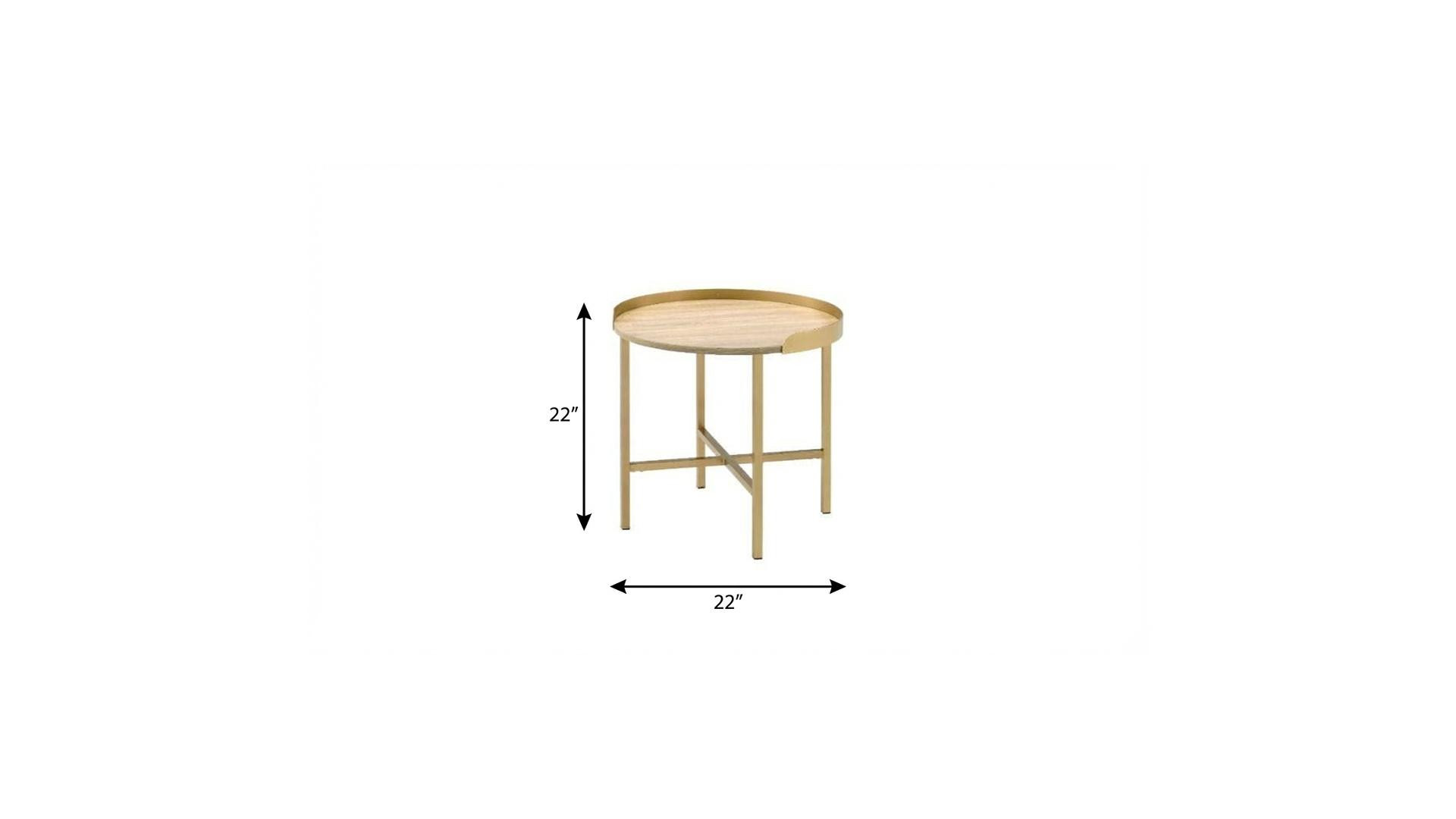 Show off your exquisite taste with this 22" gold and oak manufactured wood and metal round end table. The gold coloration of the high quality metal base marries nicely with the oak manufactured wood top. An ideal location for placing your snacks and drinks, and a place to keep your lamp, frames, or other accessories. This versatile table is a great accent for most any room. 22" H x 22" W x 22" D