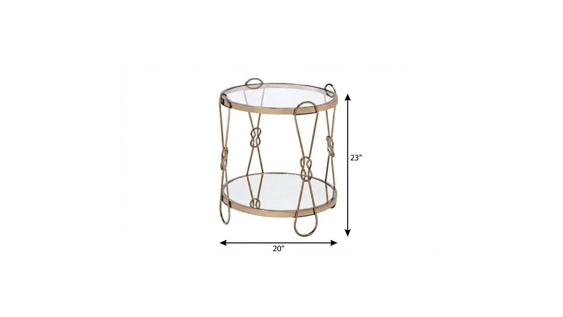 Optimize your space and add some charm to your room with the 23" gold mirrored and metal round end table with shelf. Help to keep your space organized with the included single shelf. An ideal location for placing your snacks and drinks, and a place to keep your lamp, frames, or other accessories. You can also use it as an entryway table to hold your keys. 23" H x 20" W x 20" D