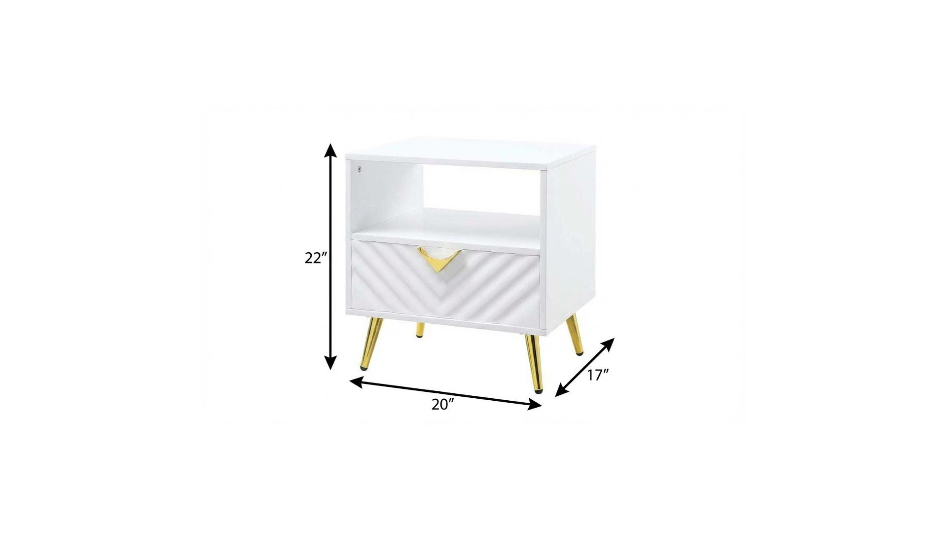 Optimize your space and add some charm to your room with the 22" white manufactured wood and metal rectangular end table with drawer and shelf. The white coloration runs throughout this good looking metal and manufactured wood table. Includes a single shelf for handy storage or display space. Includes a single easy pull out drawer for handy storage of life's little essentials. A great accent on either side of the sofa or bed, this adorable end or side table is just what you need. This versatile table is a great accent for most any room. 22" H x 20" W x 17" D
