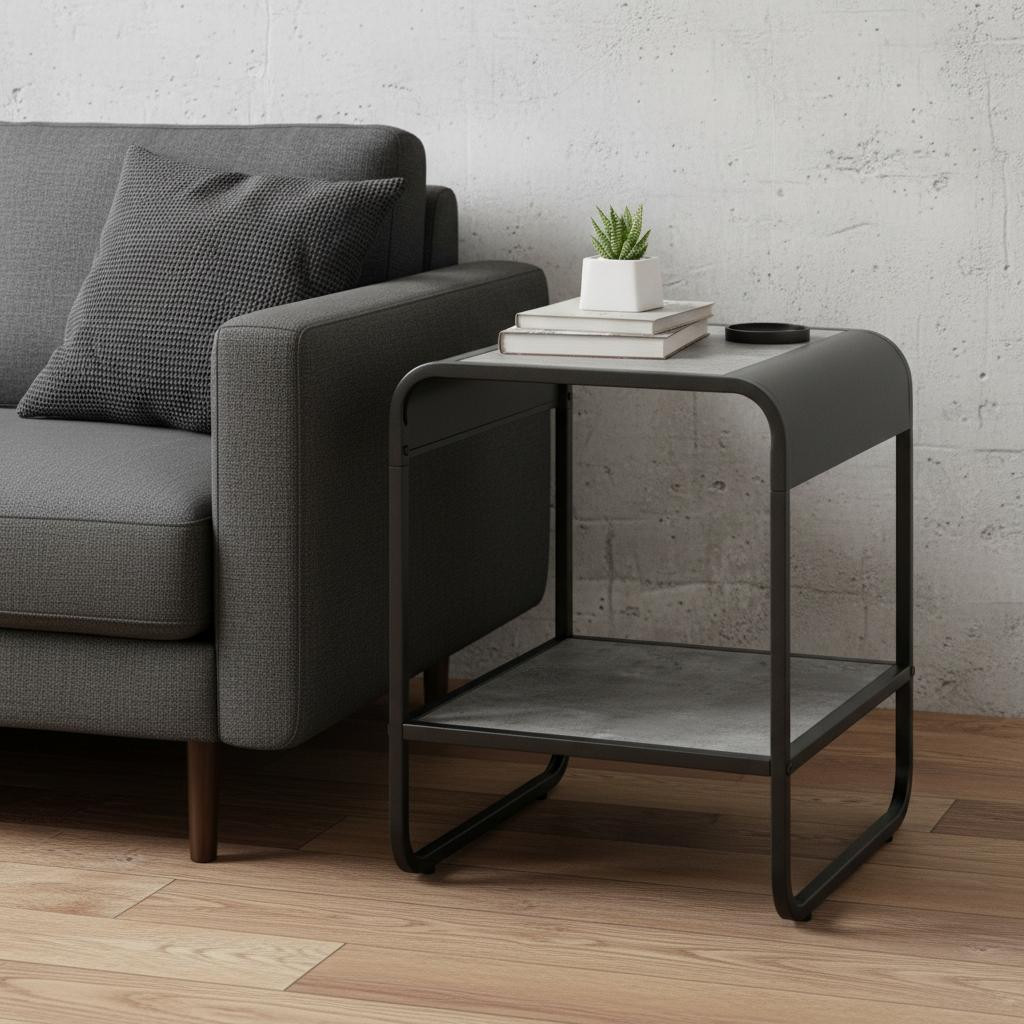 Optimize your space and add some charm to your room with the 21" black and concrete gray manufactured wood and metal rectangular end table with shelf. The black coloration of the high quality metal base marries nicely with the concrete gray manufactured wood top. Help to keep your space organized with the included single shelf. An ideal location for placing your snacks and drinks, and a place to keep your lamp, frames, or other accessories. You can match it with other pieces to get the ideal look for your place. 21" H x 16" W x 18" D